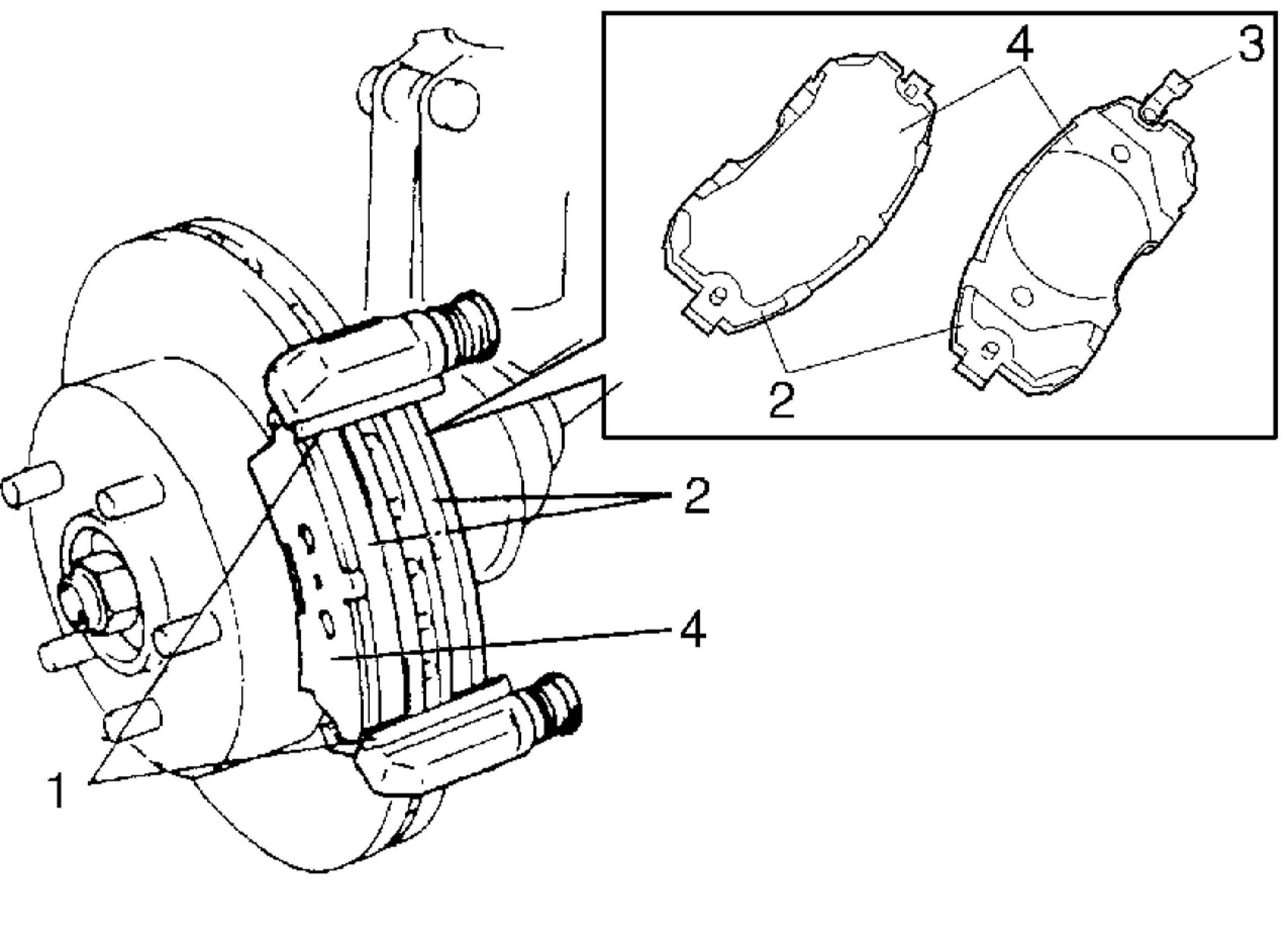 NOTE: Install the brake pad with wear indicator (3) to the vehicle center side of front right brake pad.