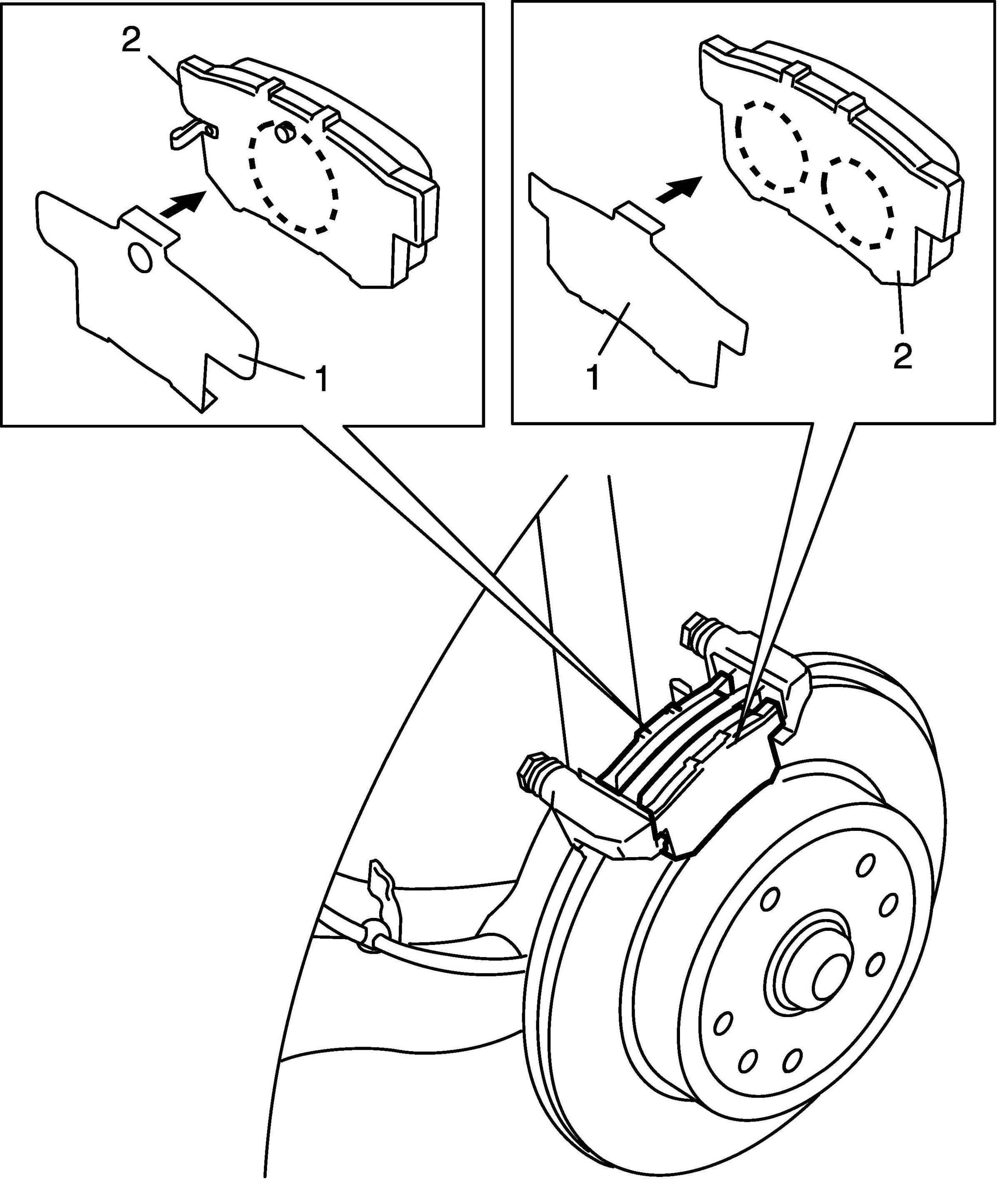 5. Set pad shims (1) to brake pads (2).