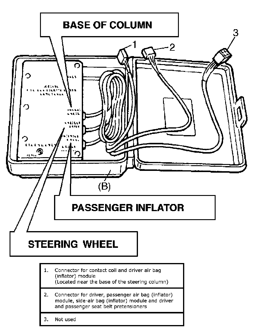 Another connector ("BASE OF COLUMN") is used to substitute the load of the driver air bag (inflator) module and the contact coil assembly when it is connected at the base of the column to the air bag wire harness.