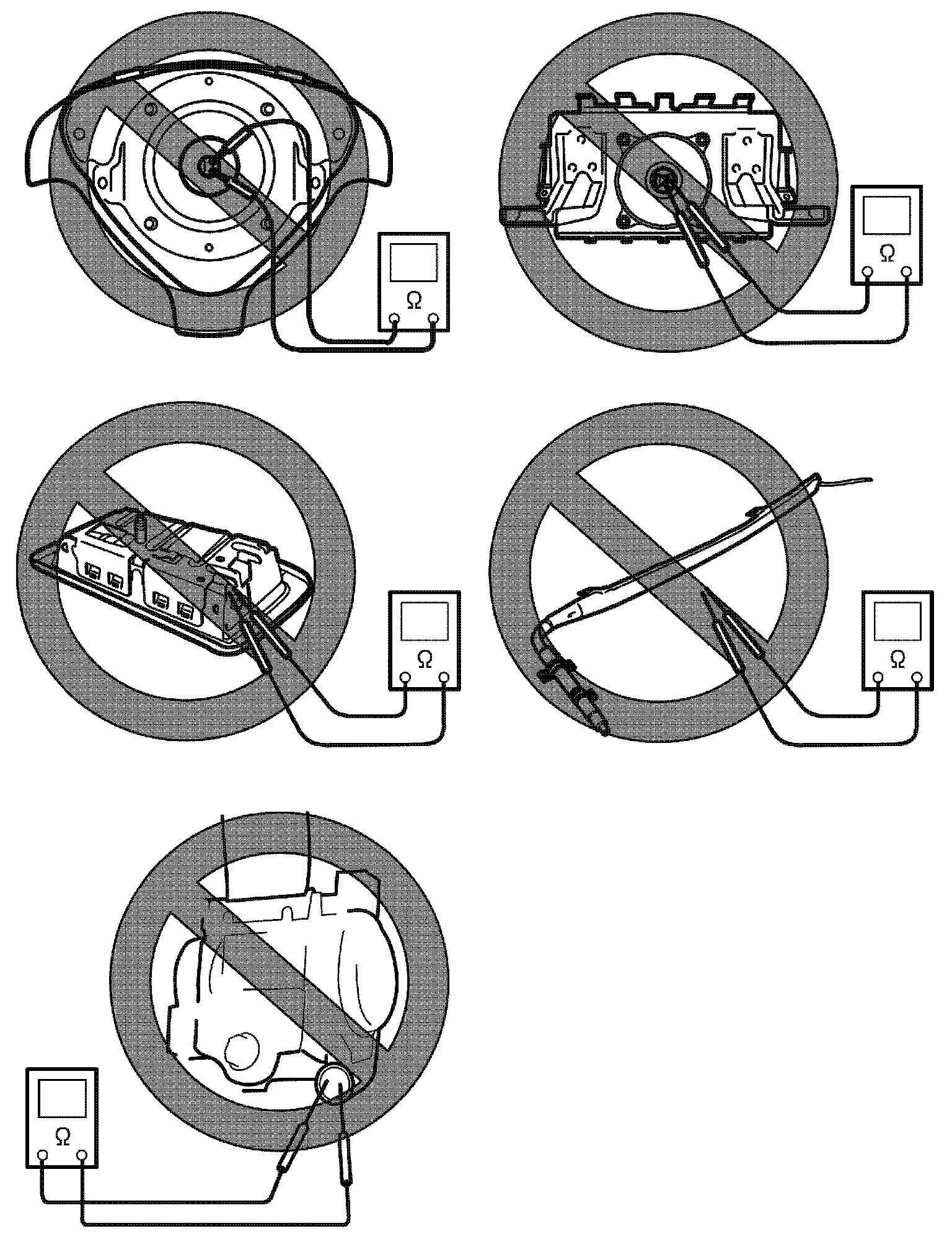 WARNING: Never attempt to measure the resistance of the air bag (inflator) modules (driver, passenger, side and curtain) and seat belt pretensioners (driver and passenger). It is very dangerous as the electric current from the tester may deploy the air bag or activate the pretensioner.