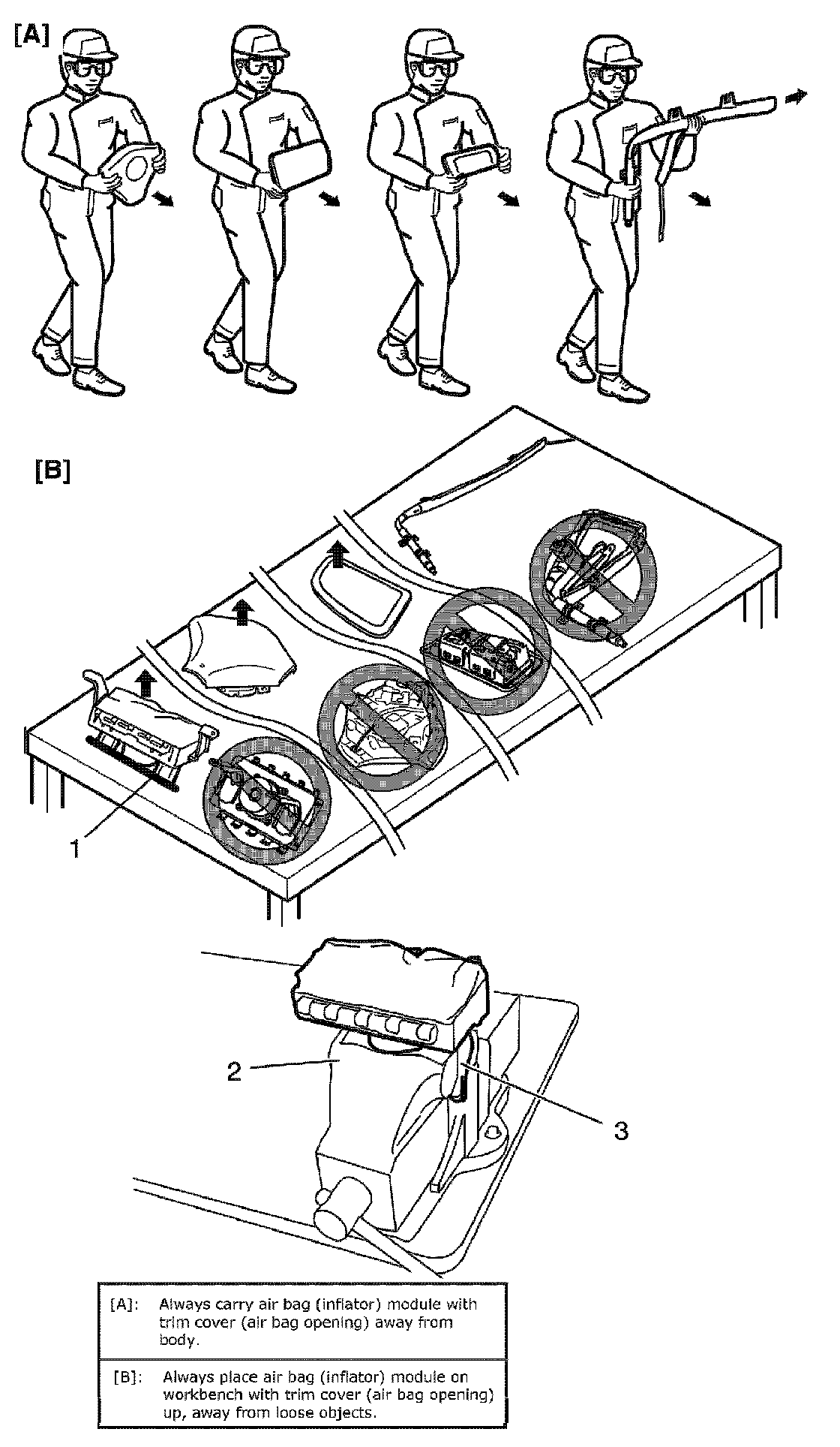 ^ When carrying a live air bag (inflator) module, make sure the bag opening is pointed away from you. In case of an accidental deployment, the bag will then deploy with minimal chance of injury. Never carry the air bag (inflator) module by the wires or connector on the underside of the module. When placing a live air bag (inflator) module on a bench or other surface, always face the bag up, away from the surface. As the live passenger air bag (inflator) module must be placed with its bag (trim cover) facing up, place it on the workbench with a slit (1) or use the workbench vise (2) to hold it securely at its lower mounting bracket (3). It is also prohibited to place anything on top of the trim cover and stack air bag (inflator) modules. This is necessary so that a free space is provided to allow the air bag to expand in the unlikely event of accidental deployment. Otherwise, personal injury may result.