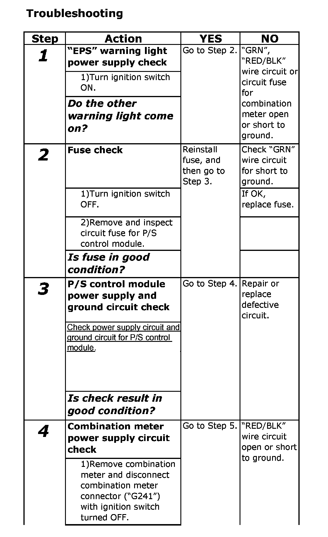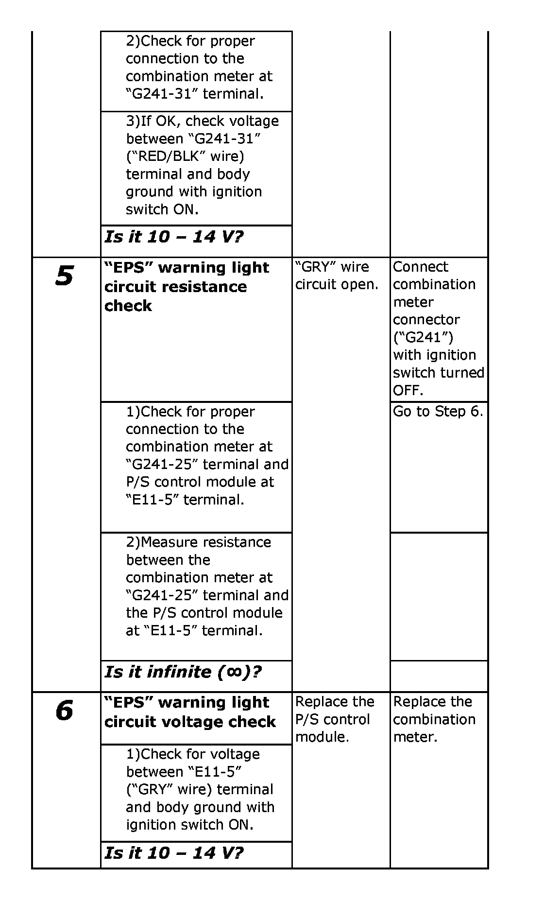 If the P/S system is in good condition, P/S control module turns "EPS" warning light ON at the ignition switch ON, and then turns it OFF at the engine start. If an abnormality in the system is detected, "EPS" warning light is turned ON continuously by P/S control module. If P/S control module is disconnected, "EPS" warning light is not turned ON.