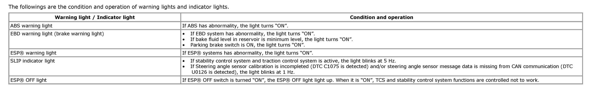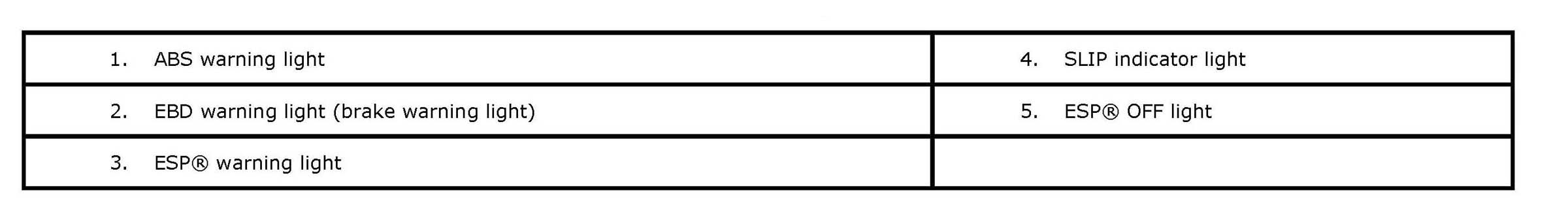 Warning Light, Indicator Light DescriptionThere are five types of warning light and indicator light in instrument cluster, which are controlled by ESP(R) control module. They give warning / indication to driver by changing the modes light ON / blinking / light OFF.