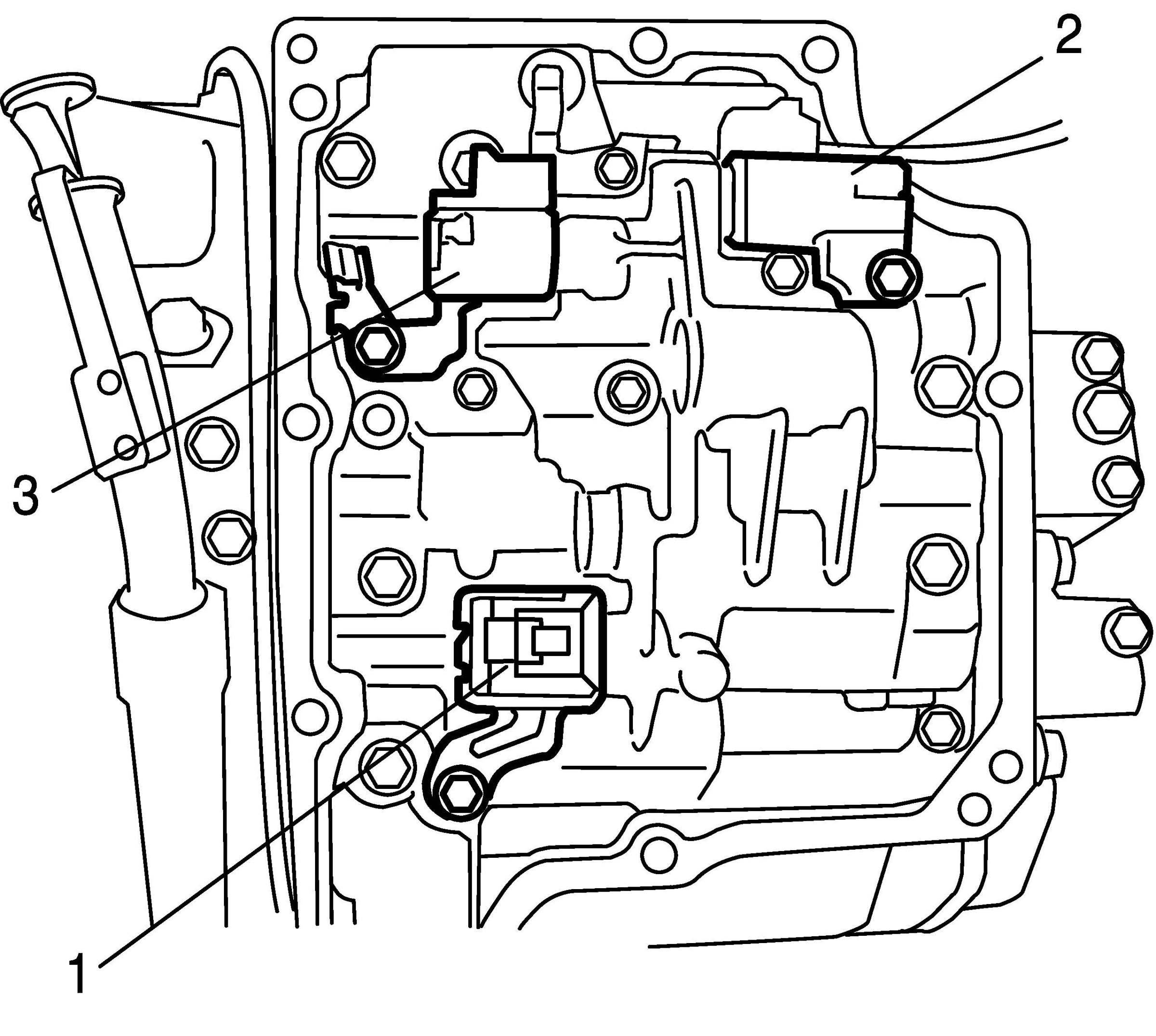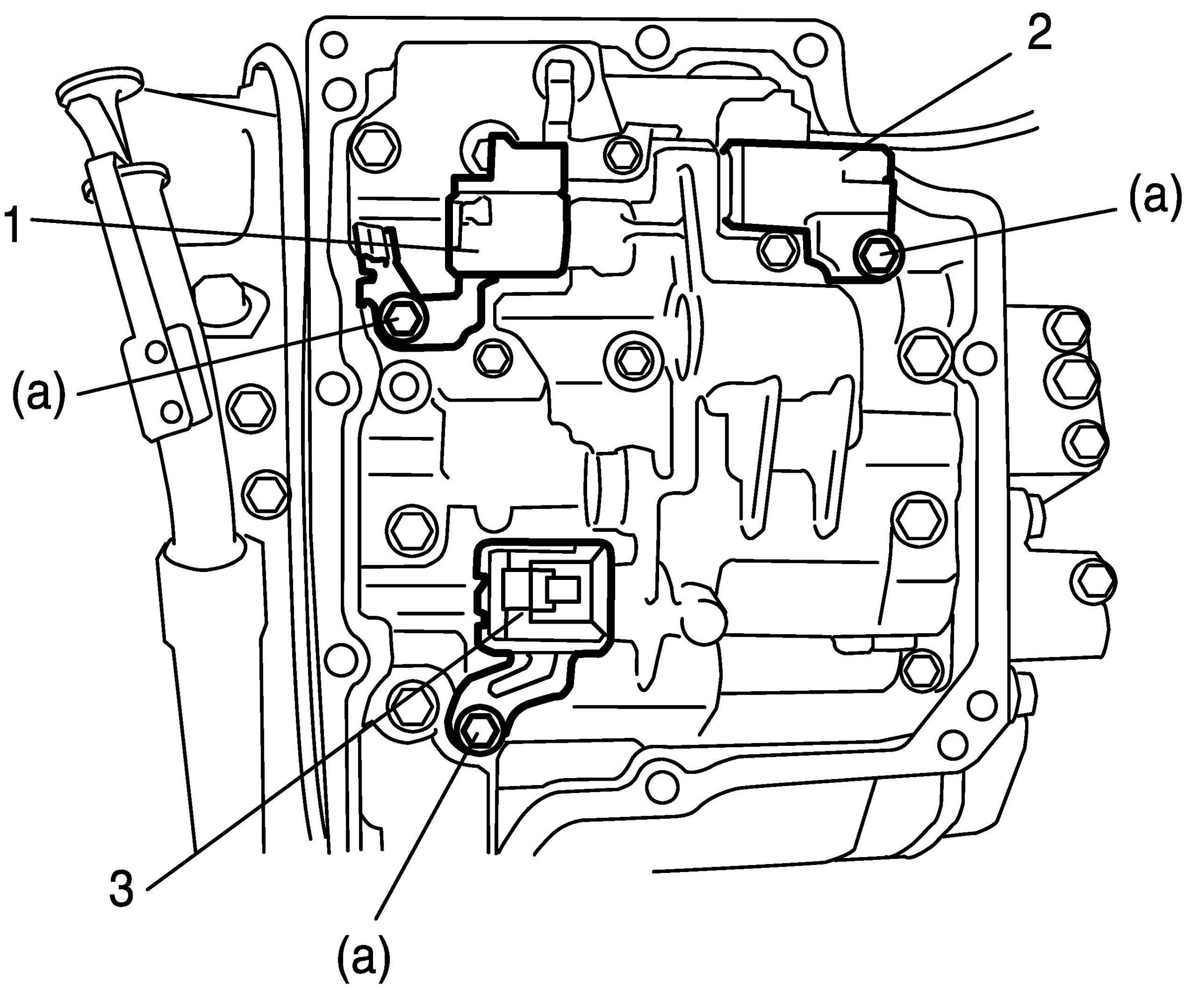7. Remove TCC solenoid valve (1), shift solenoid valve-B (No. 2) (2) and shift solenoid valve-A (No. 1) (3) by removing bolts.