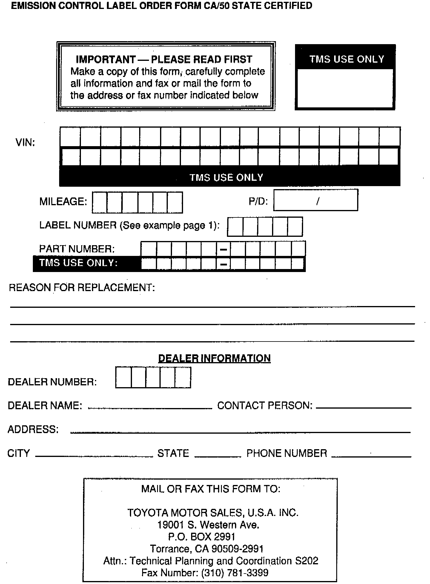 ^ For questions regarding Vehicle Emission Control Information Labels for California/50 State Certified, call (310) 781-3254.