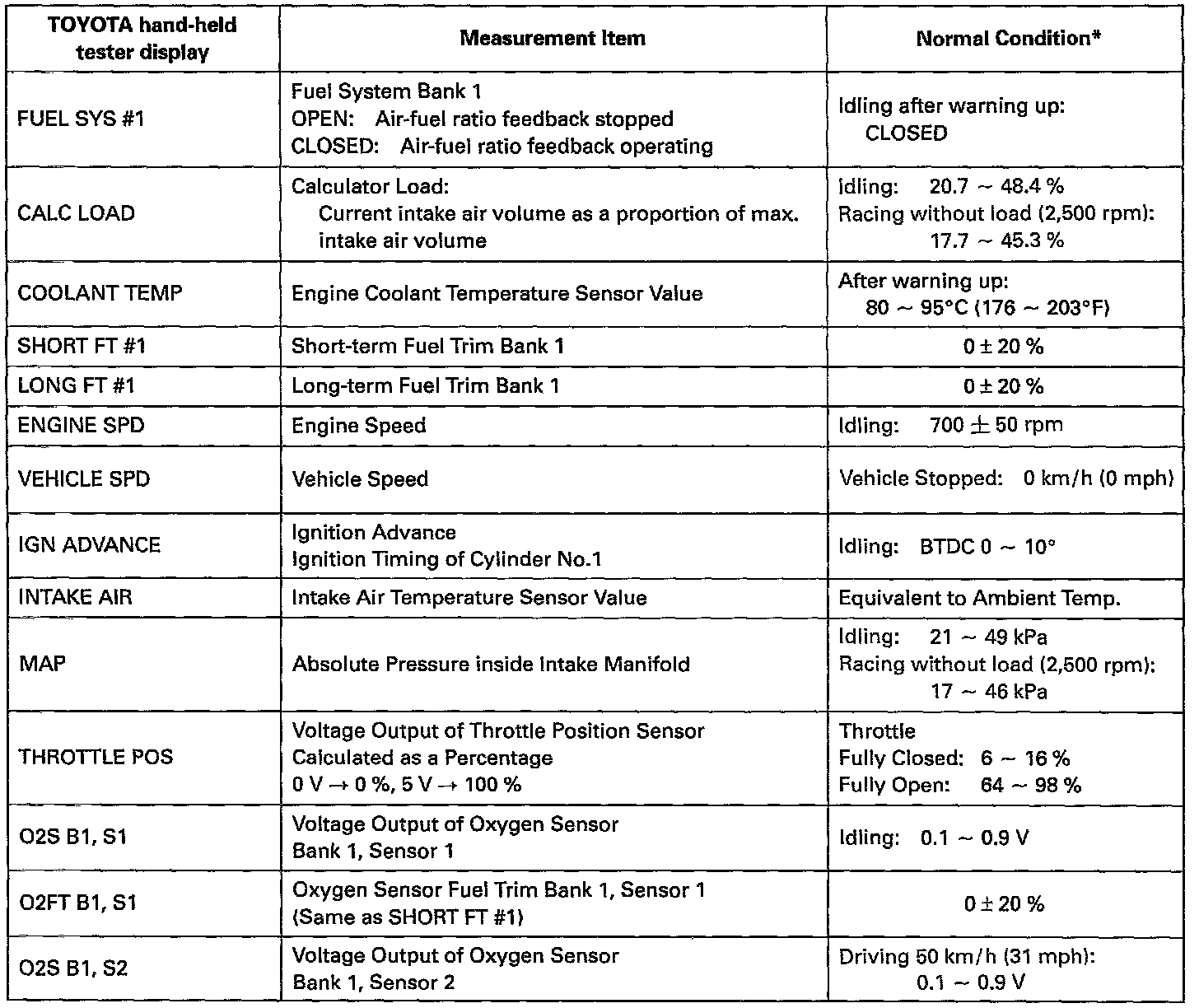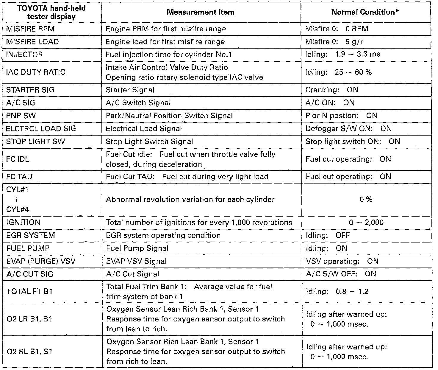 NOTICE: The values given below for "Normal Condition" are representative values, so a vehicle may still be normal even if its value varies from those listed here. So do not decide whether a part is faulty or not solely according to the "Normal Condition" here.CARB Mandated Signals