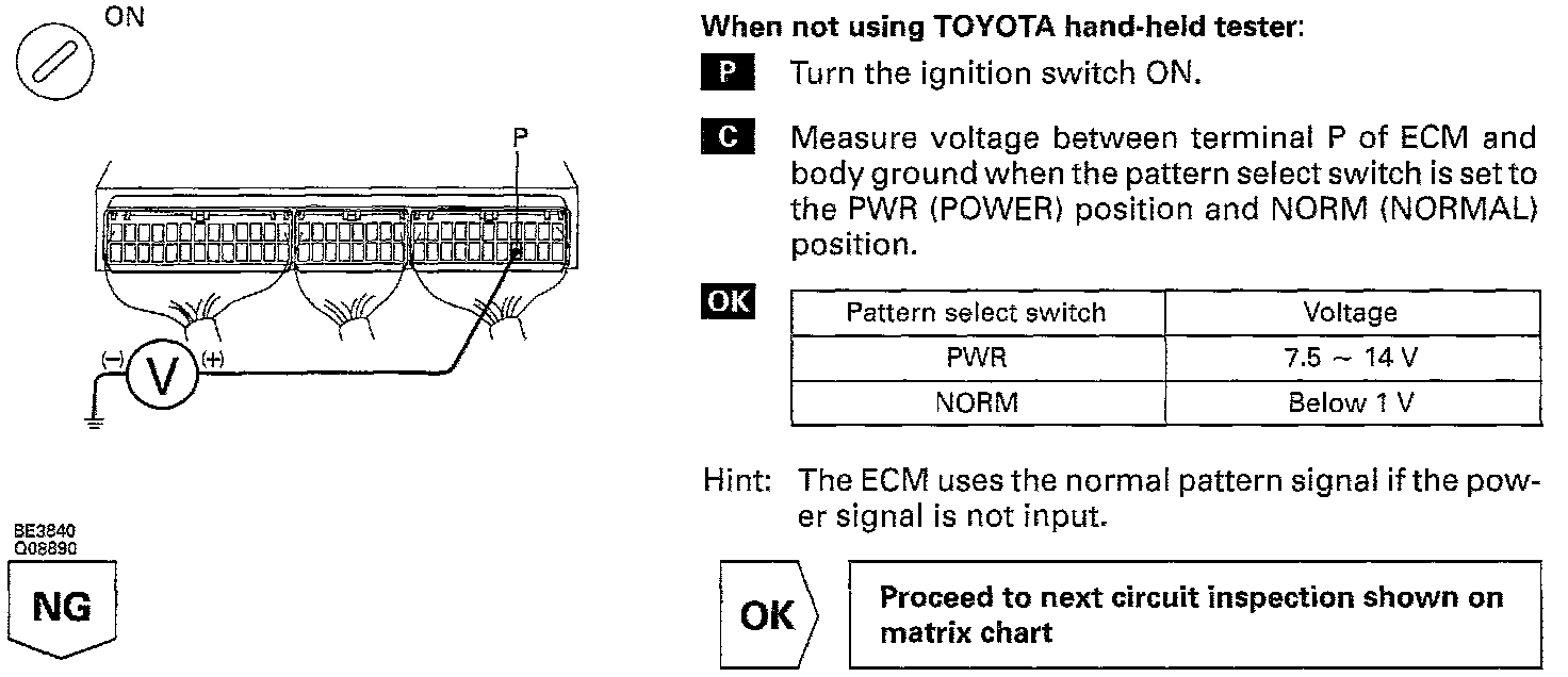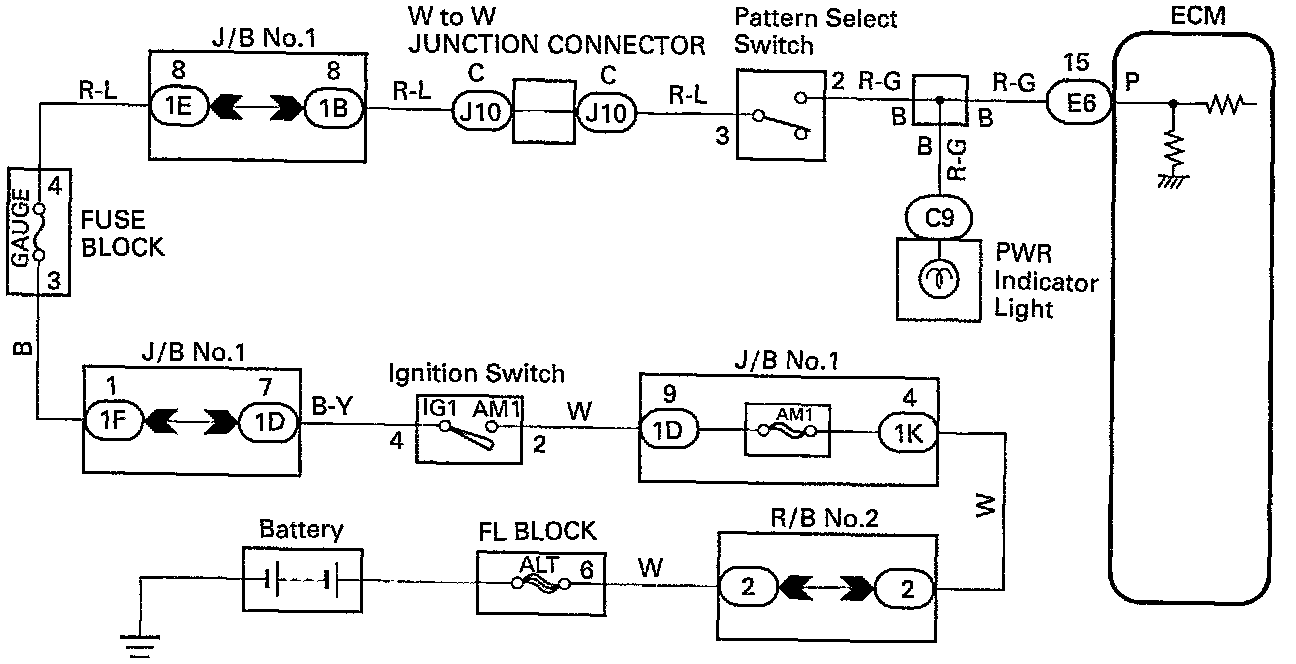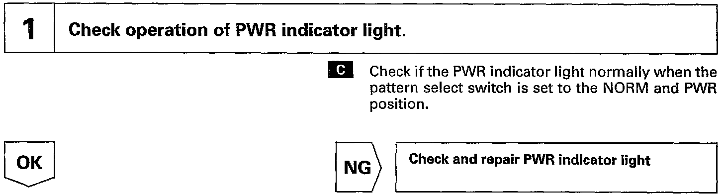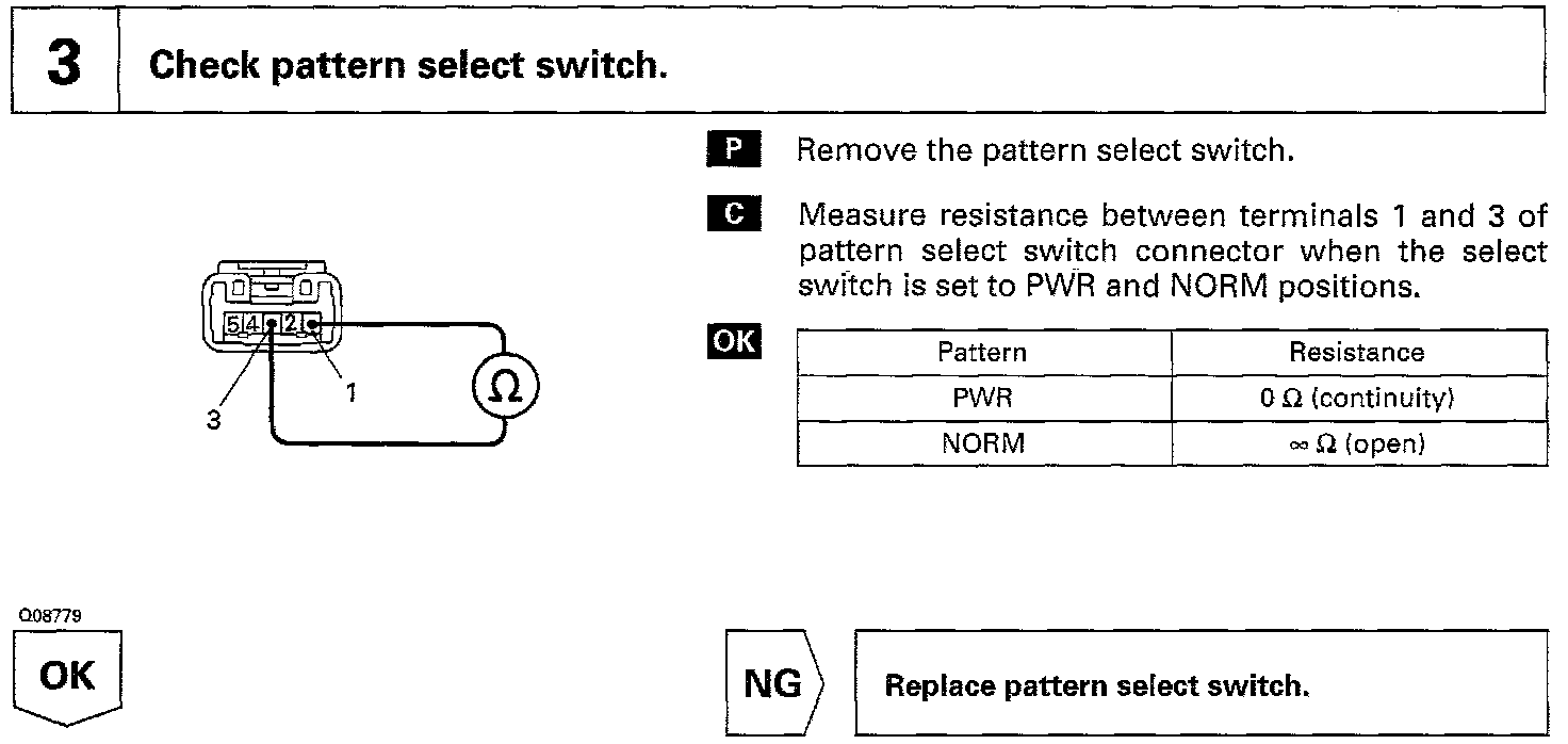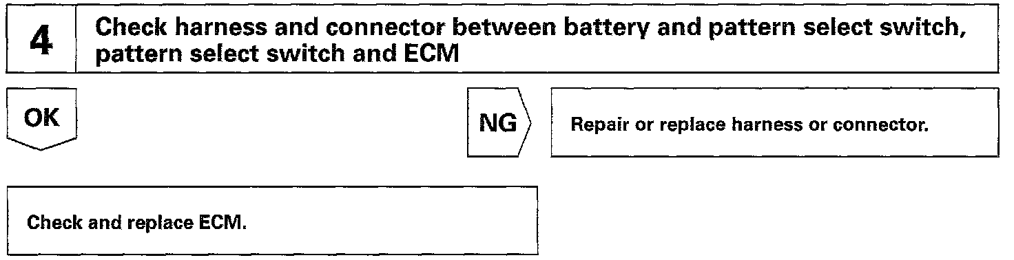 The ECM memory contains the shift programs for the NORMAL and POWER patterns, 2 and L position and the look-up patterns. Following the programs corresponding to the signals from the pattern select switch, the park/neutral position switch and other various sensors, the ECM switches the solenoid valves ON and OFF and control the transmission gear change and the lock-up clutch operation.