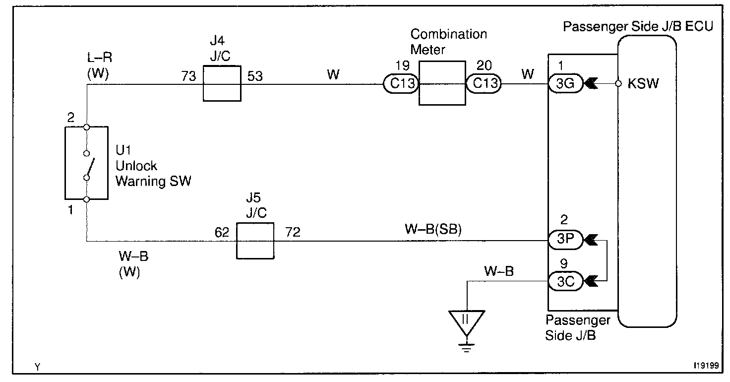 The passenger side J/B ECU operates the key confinement prevention function while the key unlock warning switch is ON.