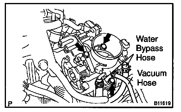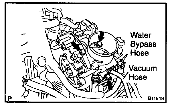 c. Disconnect the 2 water bypass hoses and vacuum hose from the throttle body.