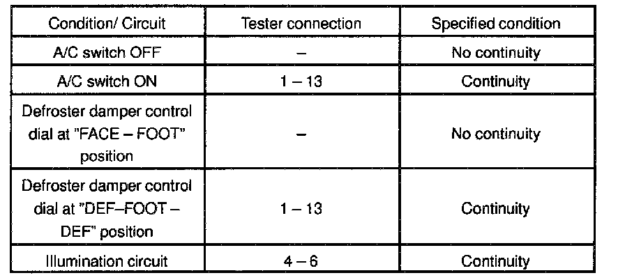 If continuity is not as specified, replace the A/C switch.