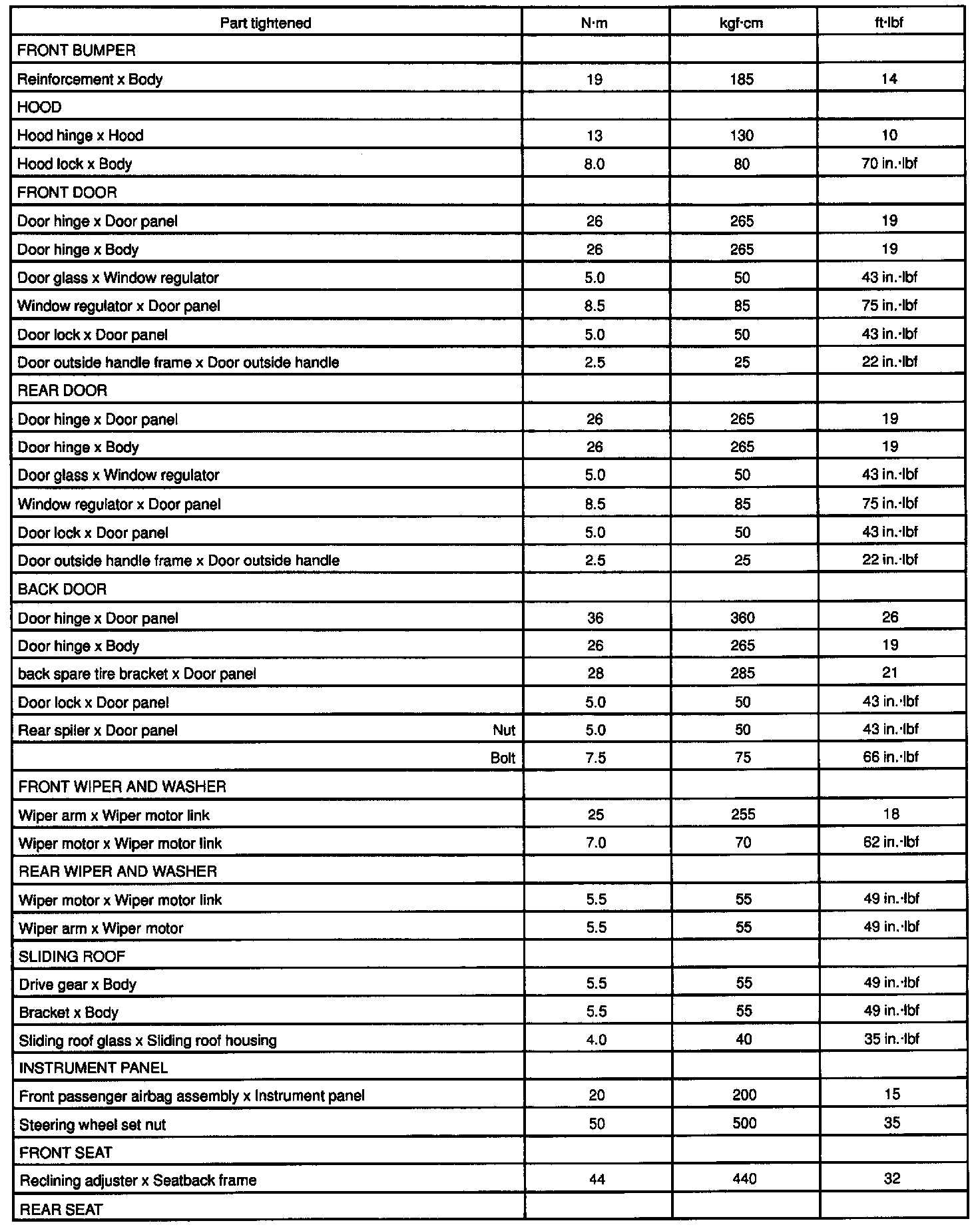 BODY TORQUE SPECIFICATION: