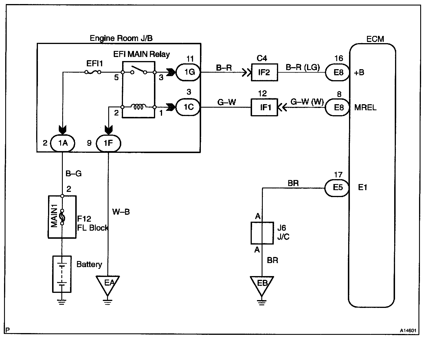 This signal causes current to flow to the coil, cutting off the contacts of the EFI main relay and supplying power to terminals +B of the ECM.