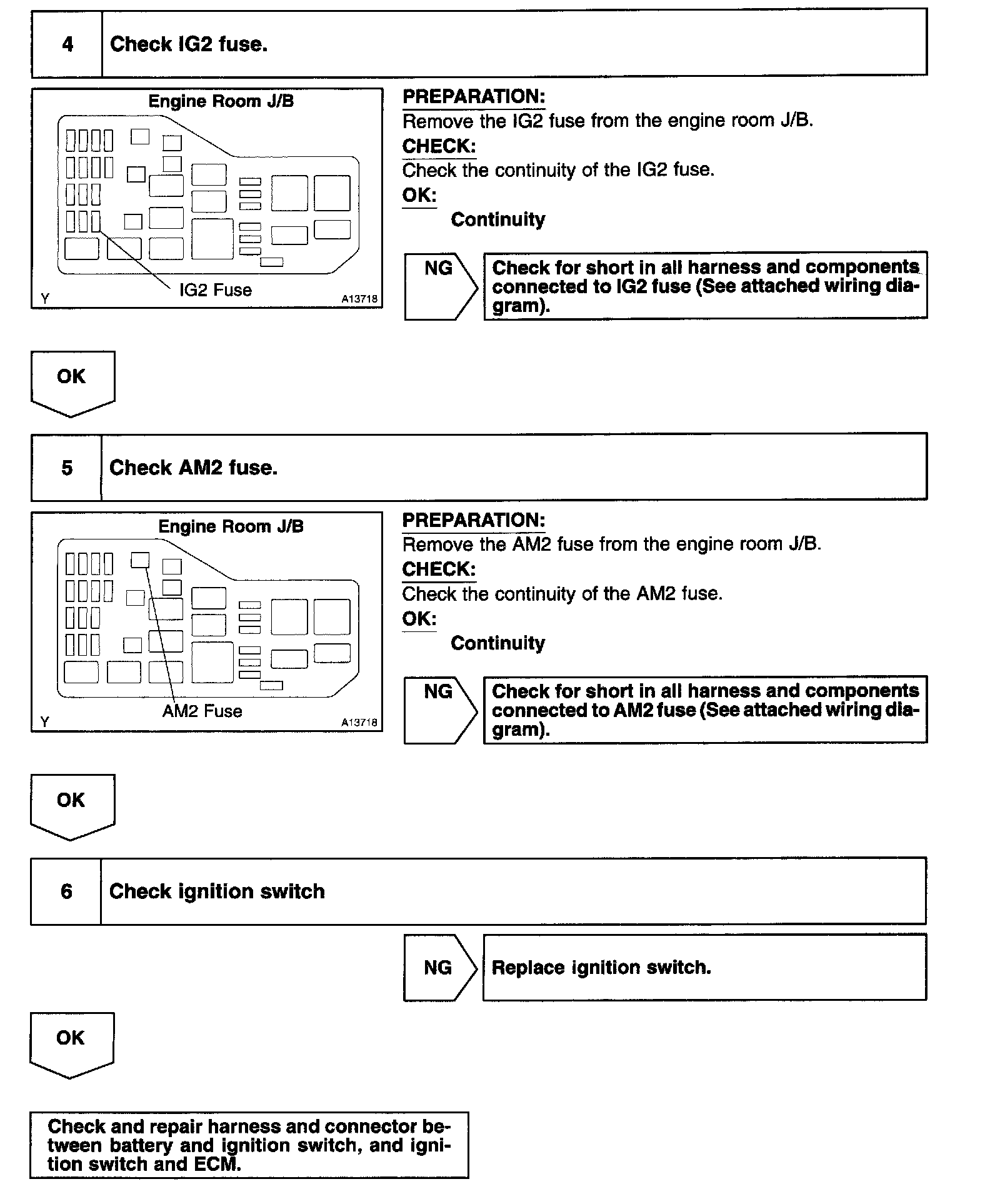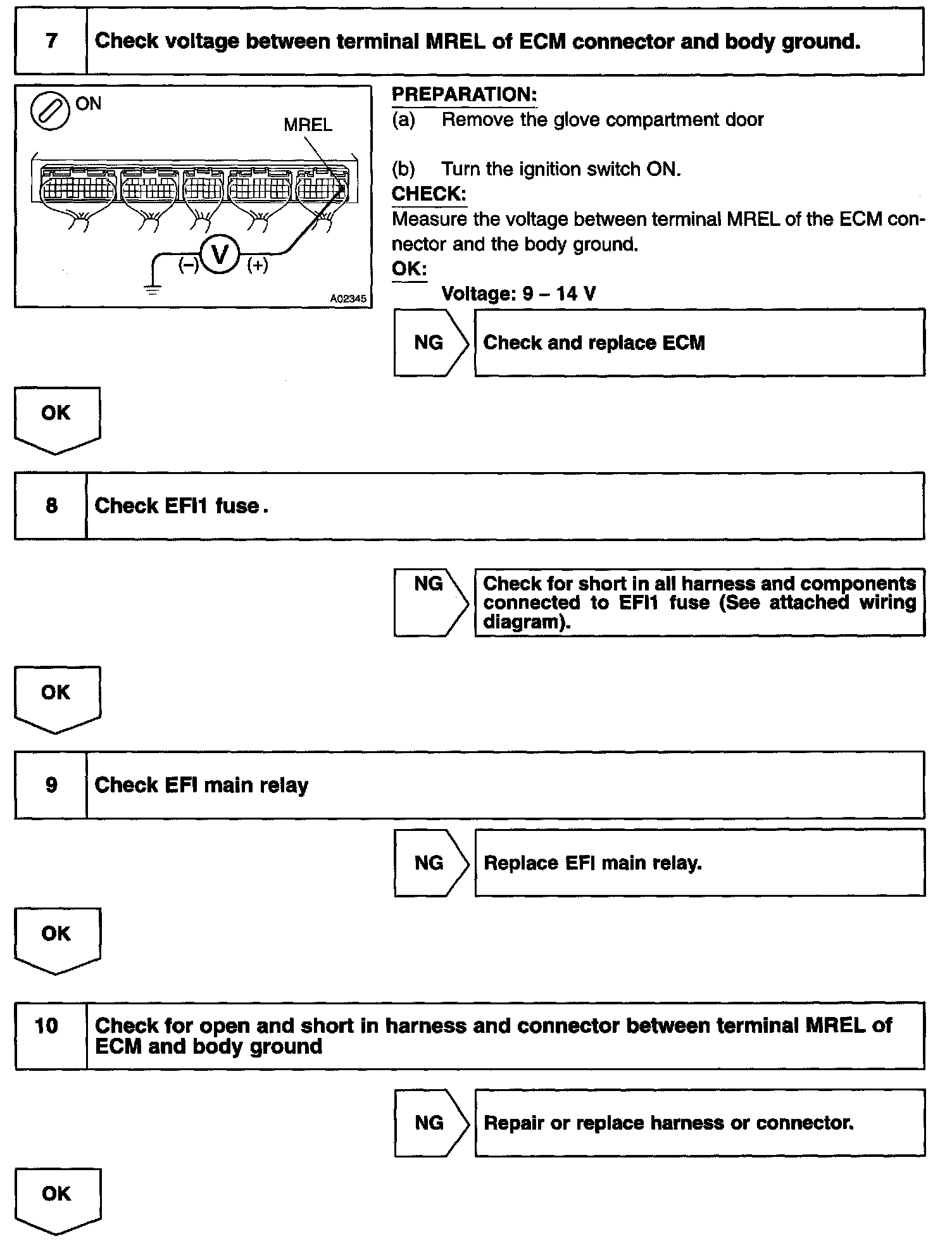 When the ignition switch is turned on, battery positive voltage is applied to IG2 Relay, terminal IGSW of the ECM and the EFI main relay control circuit in the ECM sends a signal to terminal MREL of the ECM by switching on the EFI main relay.