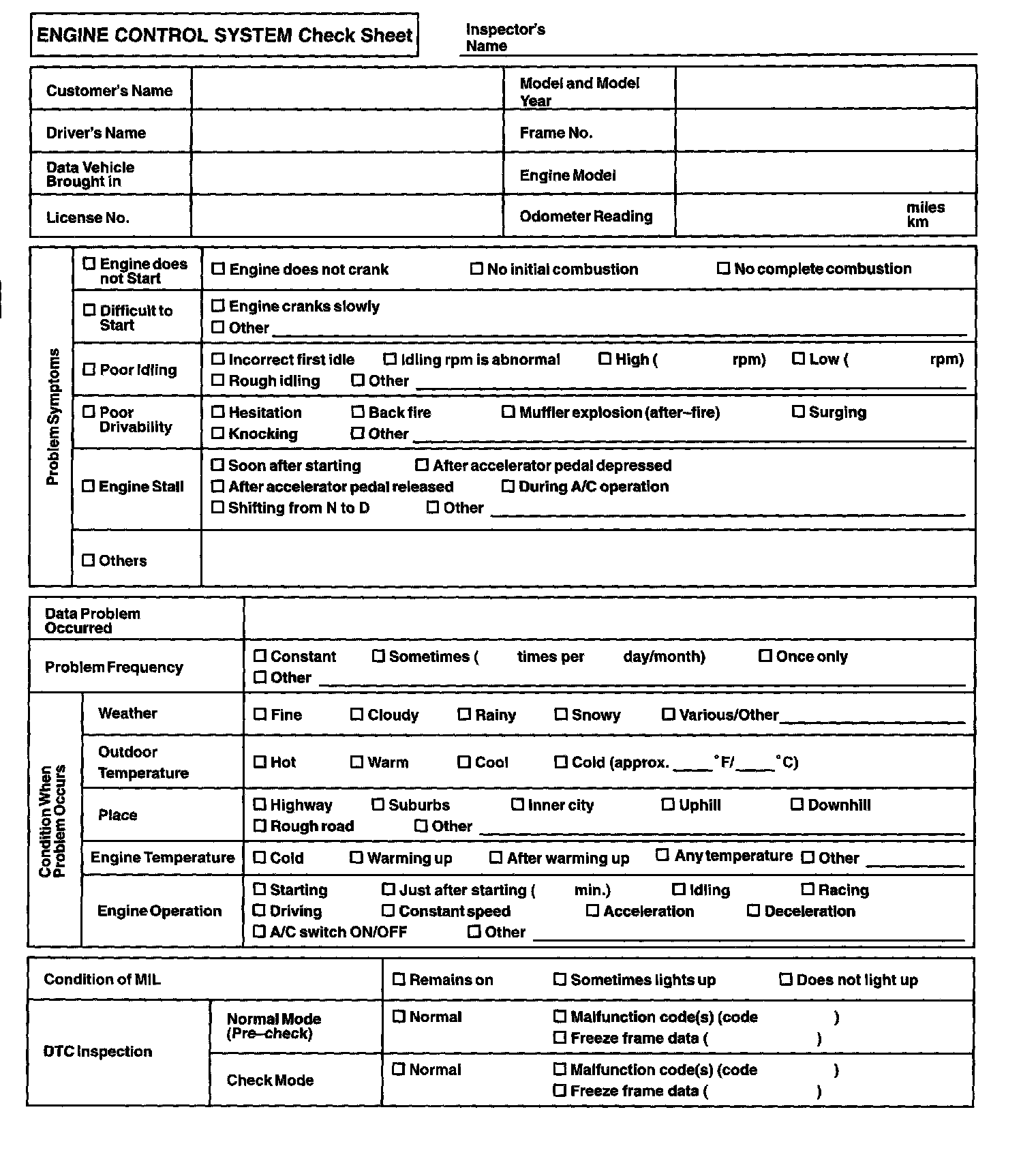 Engine Control System Check Sheet:
