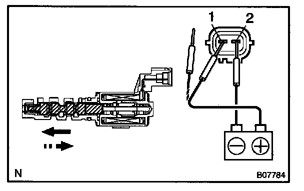 Connect the positive (+) lead from the battery to terminal 1 and negative (-) lead to terminal 2, and check the movement of the valve.