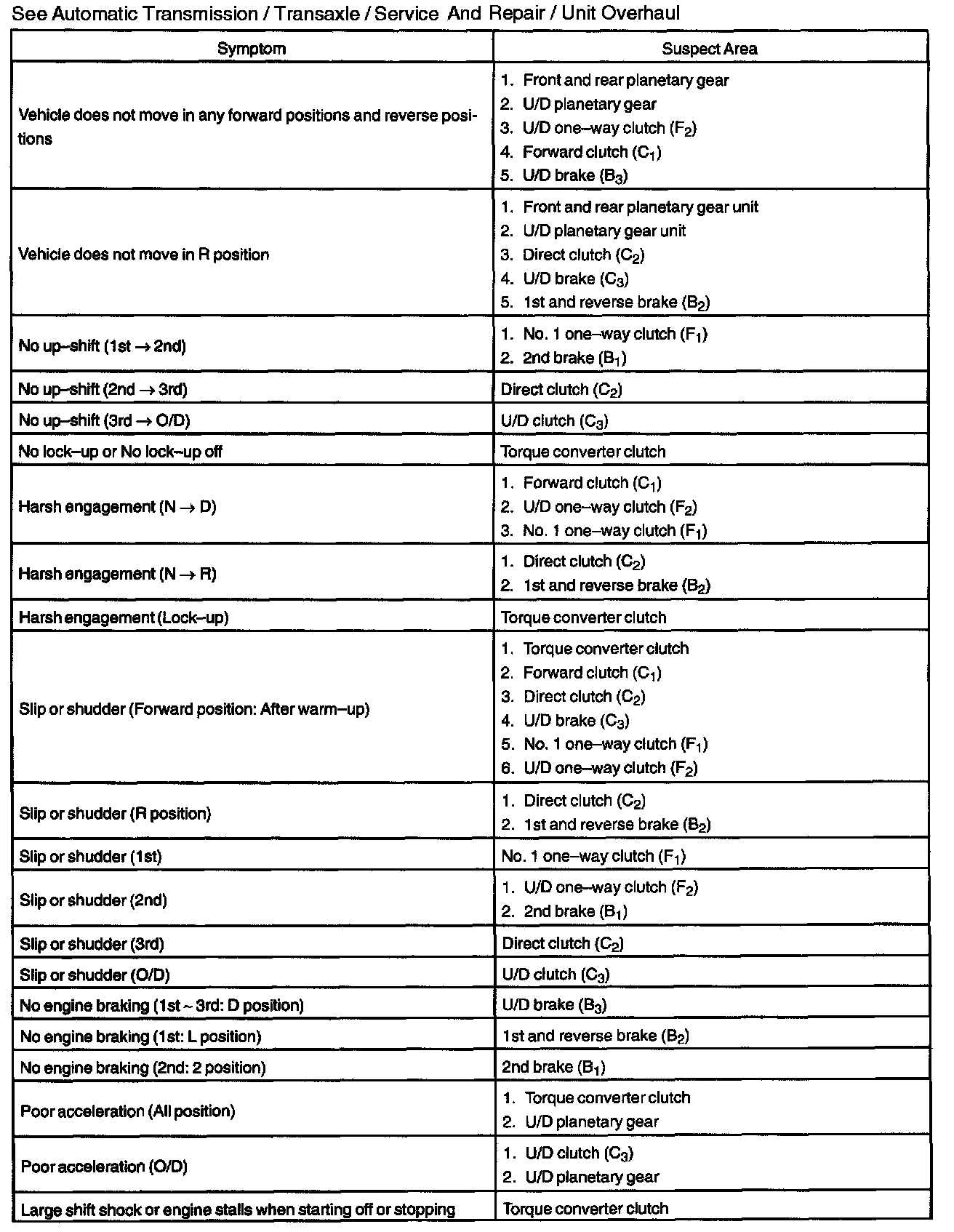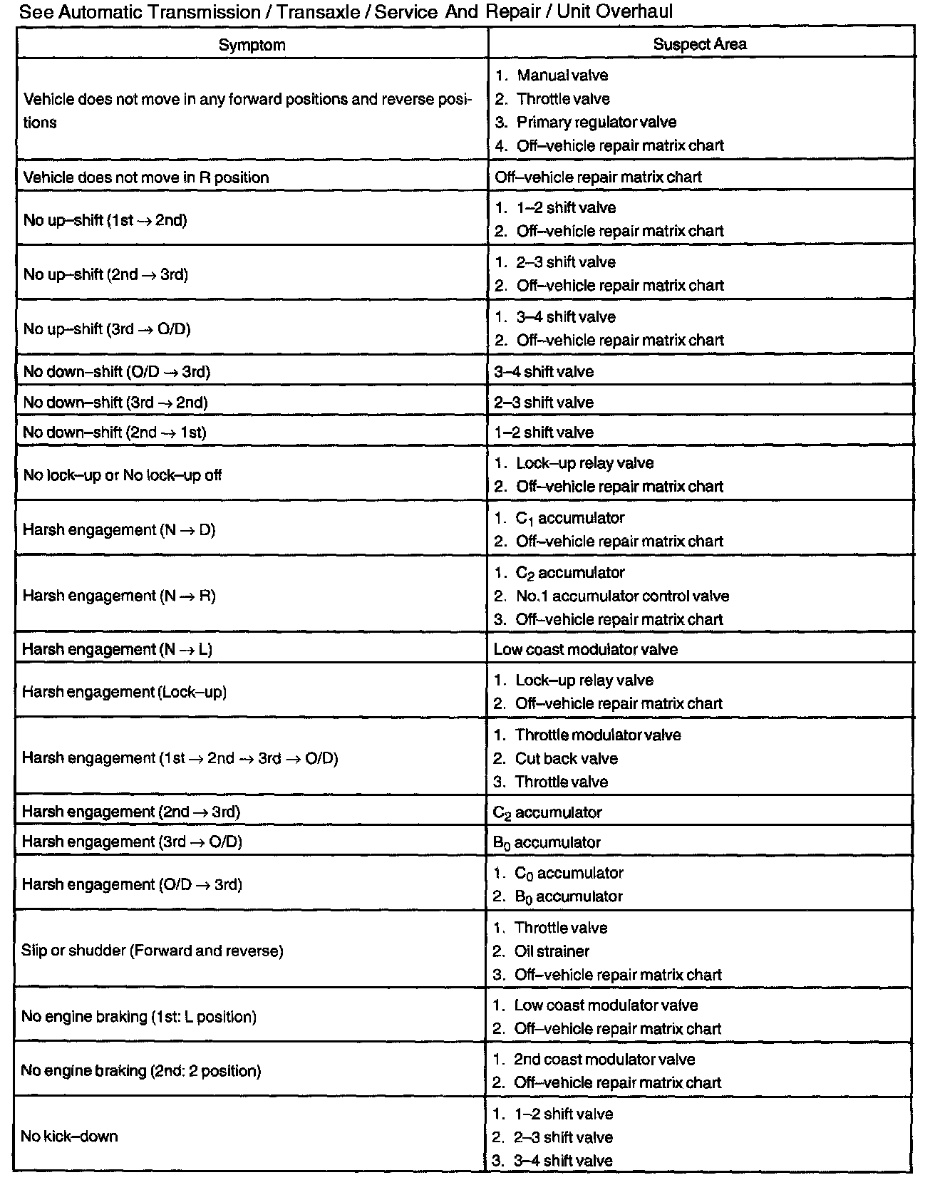 Problem Symptoms TableIf a normal code is displayed during the diagnostic trouble code check although the trouble still occurs, check the circuits for each symptom in the order given in the charts and proceed to the given troubleshooting.
