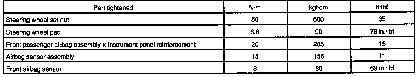 SUPPLEMENTAL RESTRAINT SYSTEM TORQUE SPECIFICATION: