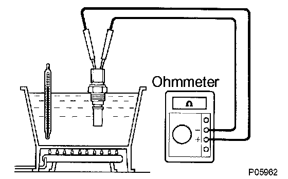 a. Using an ohmmeter, check that there is continuity between the terminals when the coolant temperature is above 93°C (199°F).