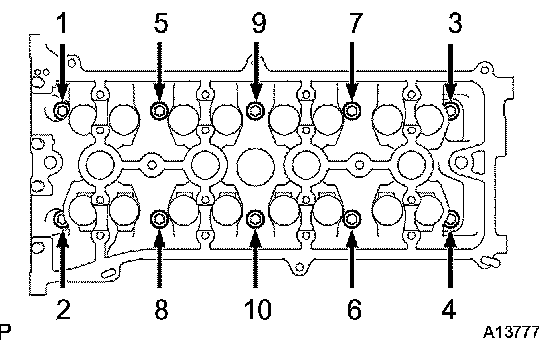 Using a 10 mm bi-hexagon wrench, install and uniformly tighten the 10 cylinder head bolts and plate washers in several passes, in the sequence shown.