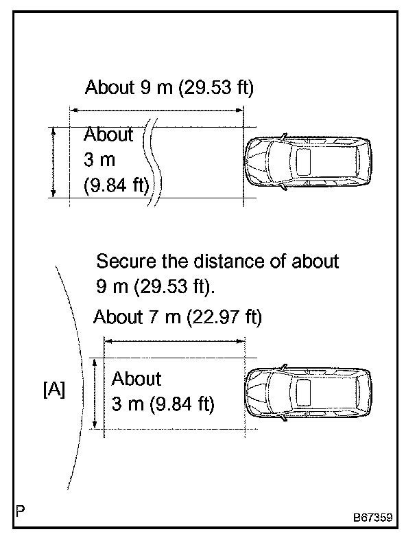 - If you can not secure a distance of about 9 m (29.53 ft) in front of the vehicle, be sure to secure at least 7 m (22.97 ft) from the vehicle, and cover the area marked [A] with a black cloth. If not covered with a black cloth, the laser sensor may detect something other than the target and it will fail to adjust properly.