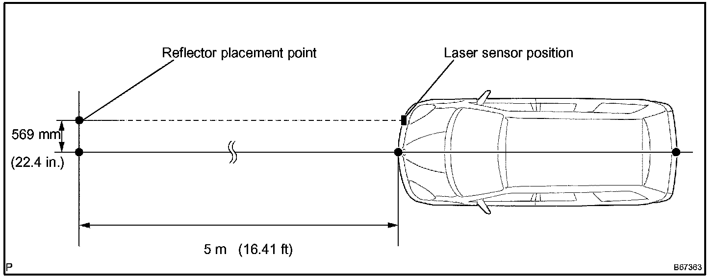 4. From the 5 m (16.41 ft) marked position, measure 569 mm (22.4 in.) to the right and place the reflector there.