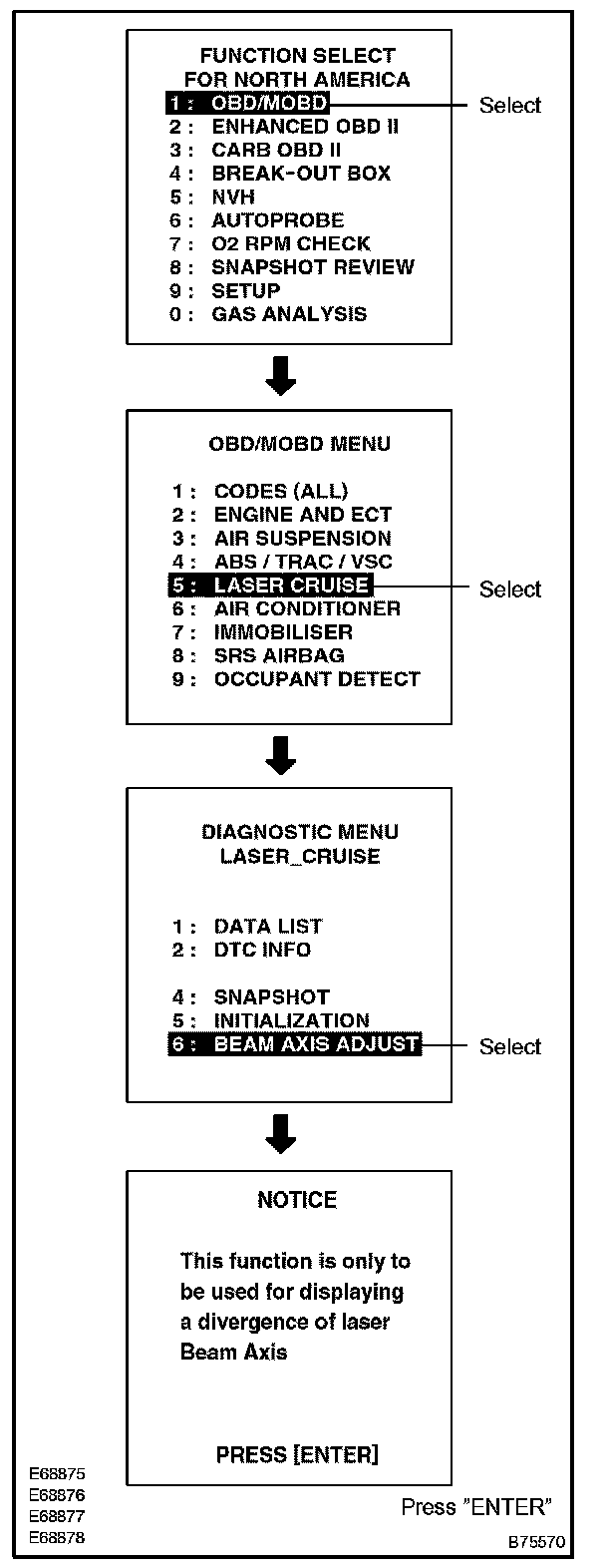 4. Operate by following the screen menu and select "BEAM AXIS ADJUST" of the Laser Cruise Control, then press "ENTER".