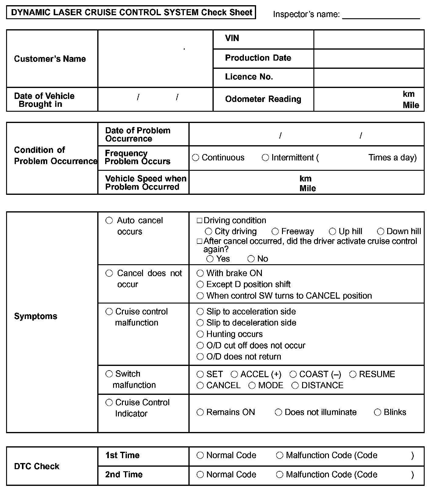 Dynamic Laser Cruise Control System Check Sheet: