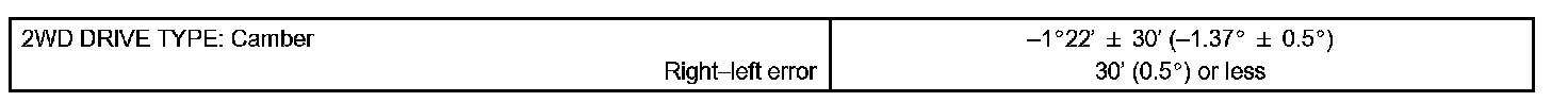 If the measured valve is not within the specified value, inspect the suspension parts for damage and/or wear and replace them if necessary because camber is not adjustable.