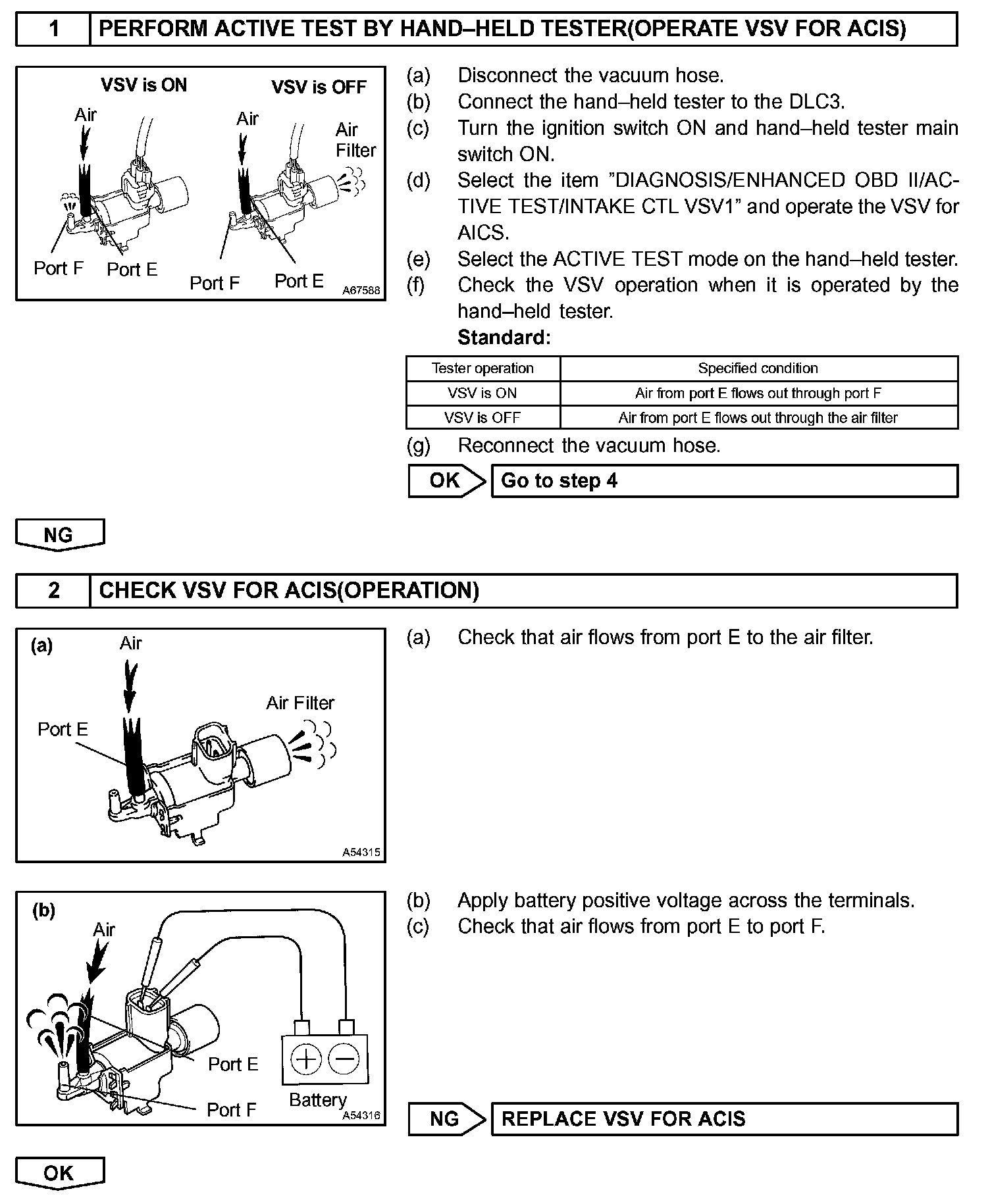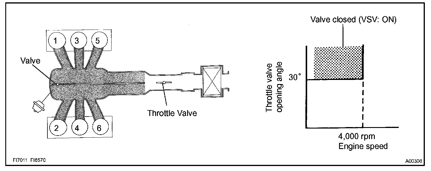 When the engine speed is 4,000 rpm or less and the throttle valve opening angle is 30° or more, the ECM turns the VSV ON or OFF and operate the Intake Air Control Valve.
