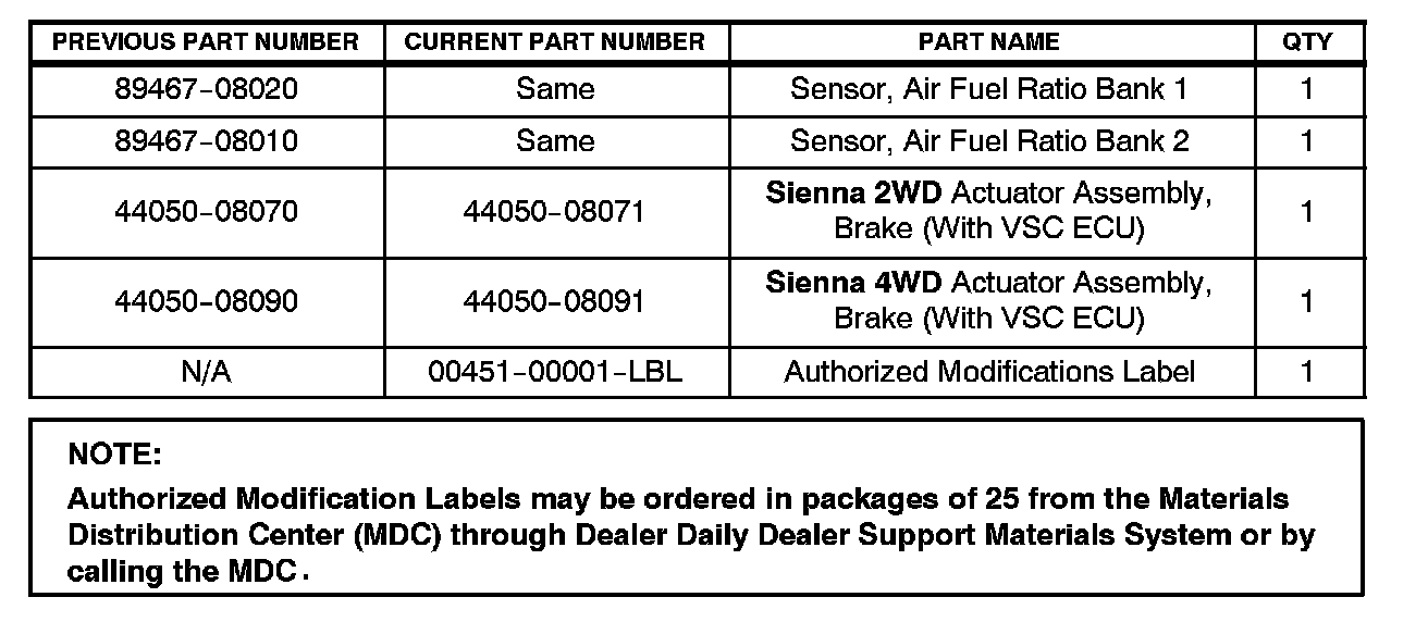 8. For vehicles equipped with laser cruise control, a new Brake Actuator Assembly (with VSC ECU) must be installed at the time of recalibration. If vehicle is equipped with laser cruise, use the Parts Information table to order the correct part (2WD or 4WD) and follow the instructions listed on TIS: 2004 model year Sienna Repair Manual: Brake: Brake Actuator Assy (w/VSC): Replacement (Sienna) to replace the Brake Actuator Assembly (with VSC ECU).