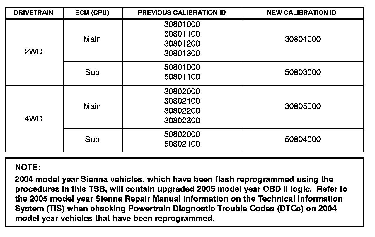 Under certain driving conditions, some 2004 model year Sienna vehicles may exhibit a M.I.L. "ON" with at least one of the following DTCs: