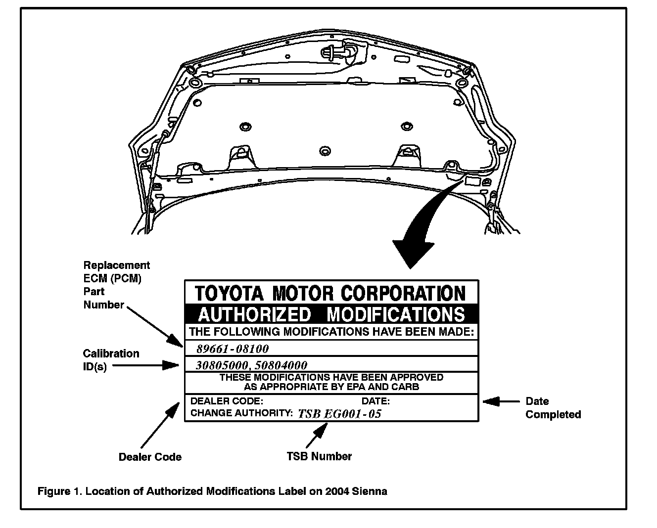 2. Check for the Authorized Modifications Label affixed to the vehicle in the location shown in Figure 1. Confirm if ECM (PCM) calibration has been updated. If not the latest ECM (PCM) calibration go to step 3.