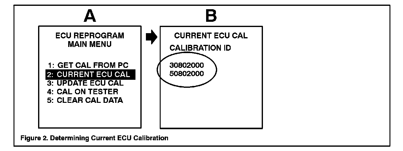 3. Connect the Diagnostic Tester to the vehicle and select CURRENT ECU CAL from the ECU REPROGRAM MAIN MENU. Determine the vehicle's current ECU calibration (see Figure 2).