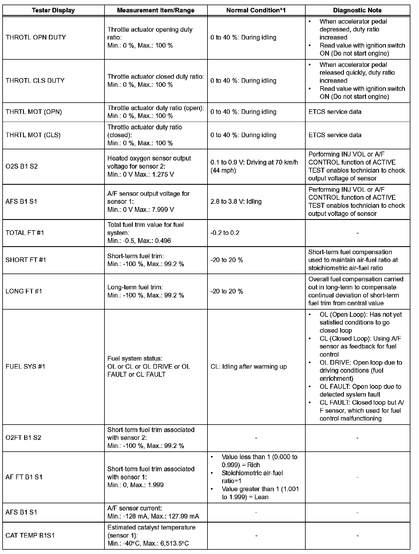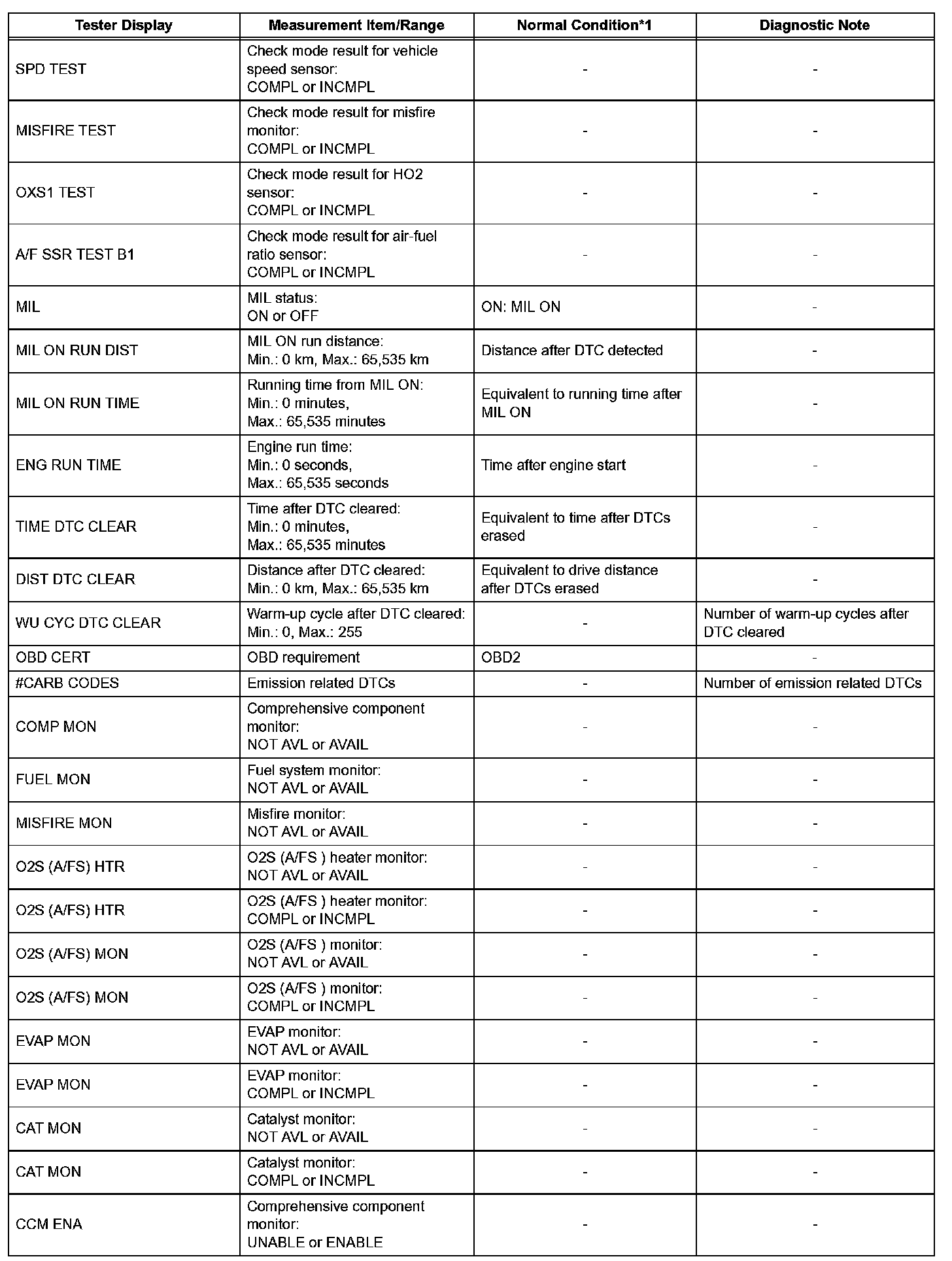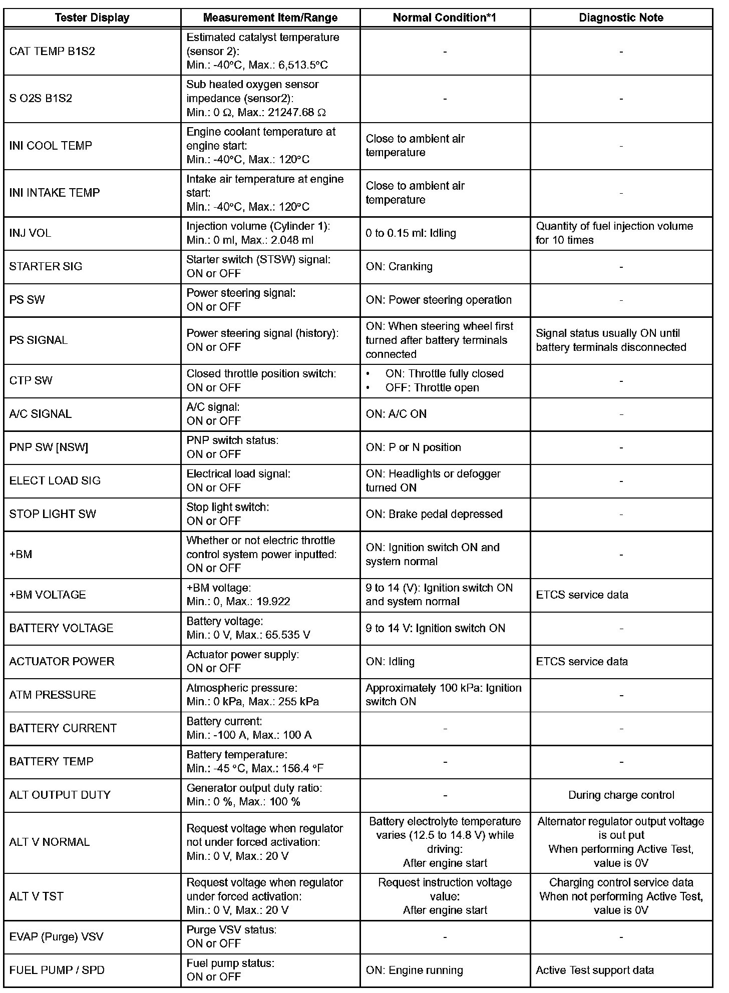 DATA LISTHINT: By reading the DATA LIST displayed on an intelligent tester, values can be checked, including those of the switches, sensors, and actuators, without removing any parts. Reading the DATA LIST as the first step of troubleshooting is one method of shortening diagnostic time.