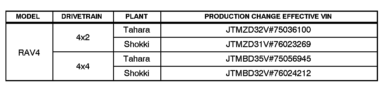 ^ 2006 - 2007 model year RAV4 vehicles equipped with 2AZ-FE engine and 4-speed automatic transmission and produced BEFORE the Production Change Effective VINs below.