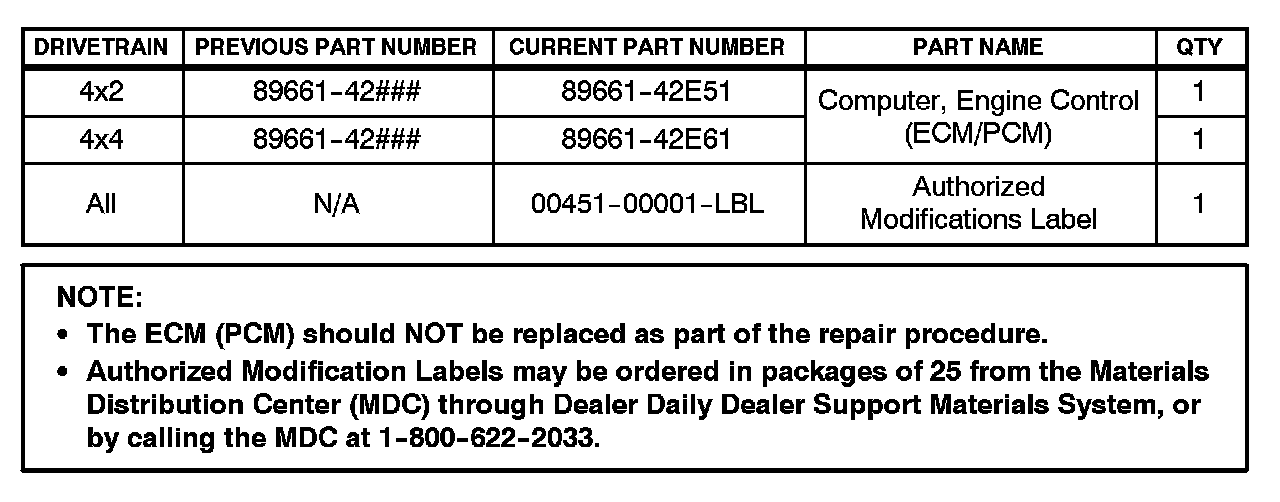^ Before proceeding, verify the ECM (PCM) calibration has NOT been updated by checking for the Authorized Modifications Label (shown in step 1 of the Repair Procedure).