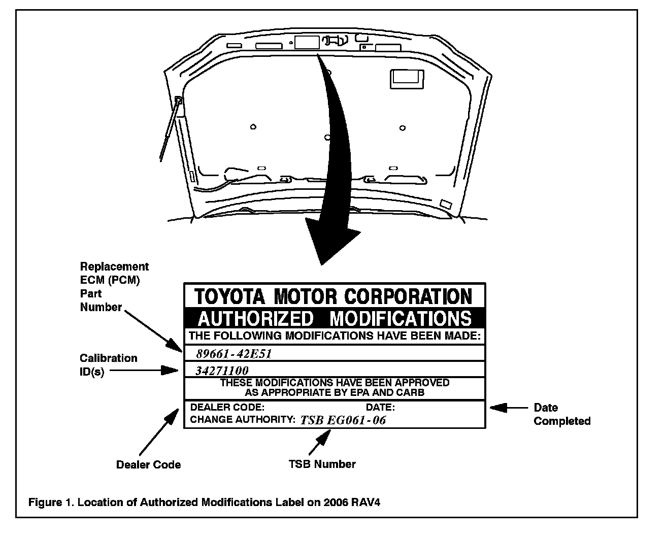 1. Check for the Authorized Modifications Label affixed to the vehicle in the location shown in Figure 1. Confirm if the ECM (PCM) calibration has been updated. If the calibration listed is NOT the latest ECM (PCM) calibration go to step 2.