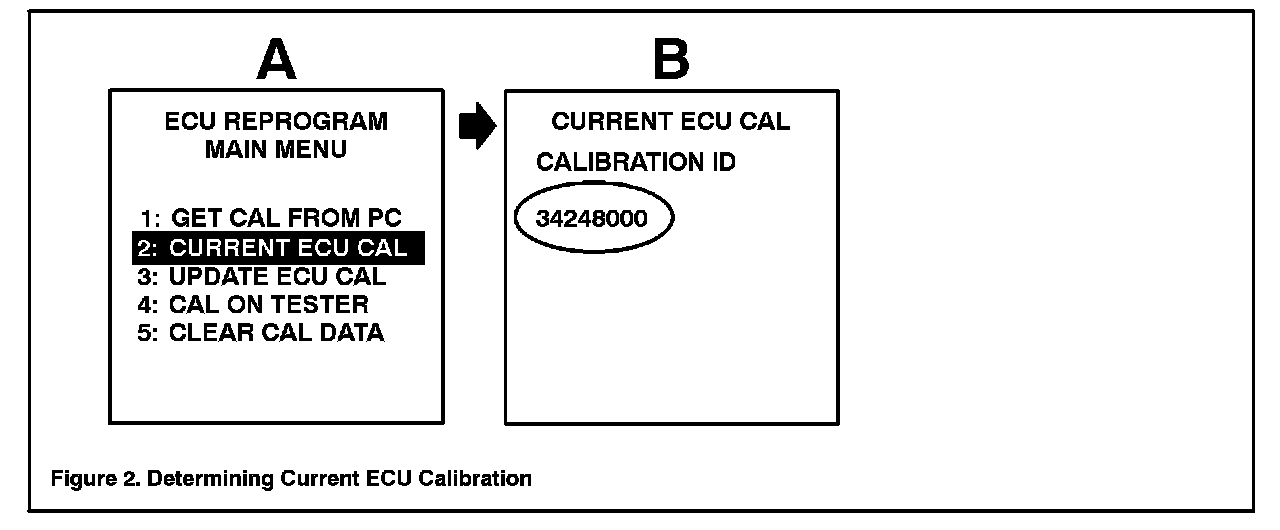 2. Connect the Diagnostic Tester to the vehicle and select CURRENT ECU CAL from the ECU REPROGRAM MAIN MENU. Determine the vehicle's current ECU calibrations (see Figure 2).