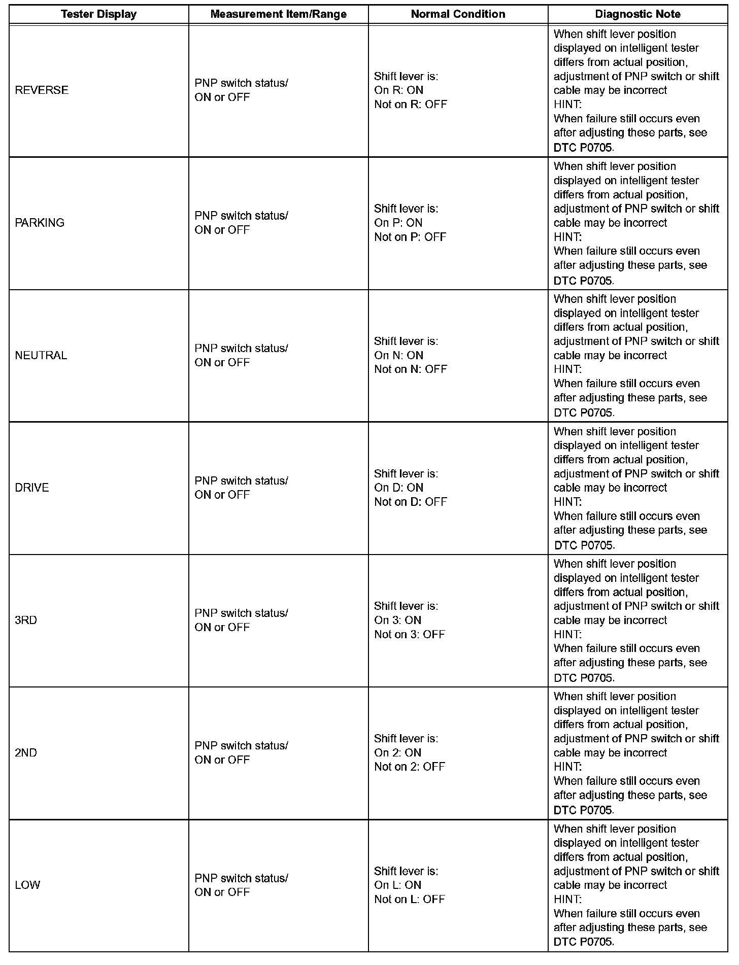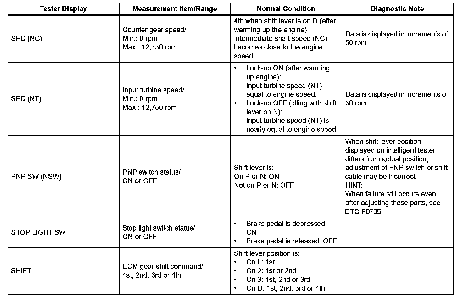 HINT: Using the intelligent tester's DATA LIST allows switch, sensor, actuator, and other item values to be read without removing any parts. Reading the DATA LIST early in troubleshooting is one way to save time.