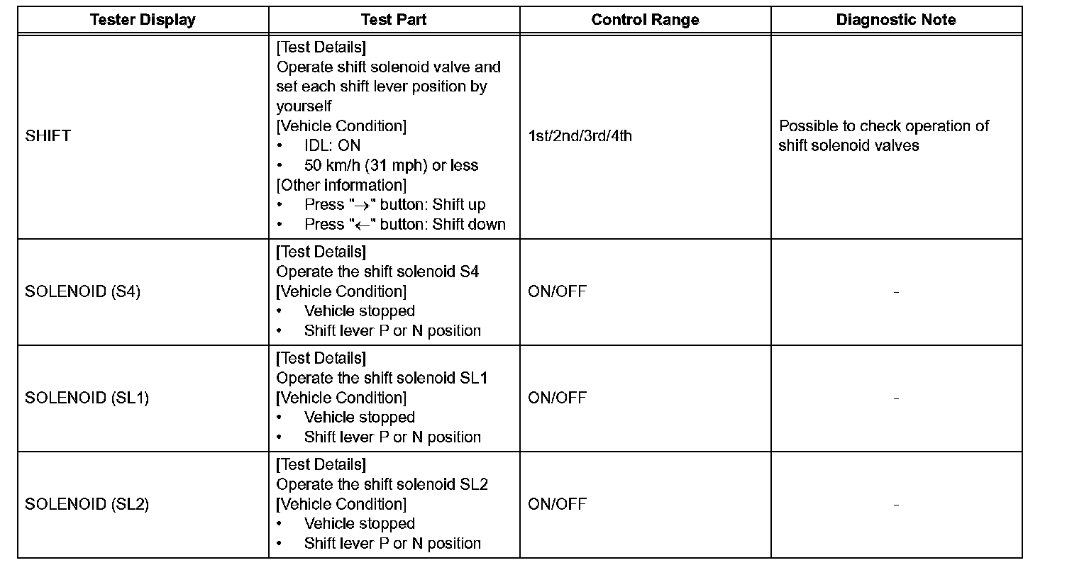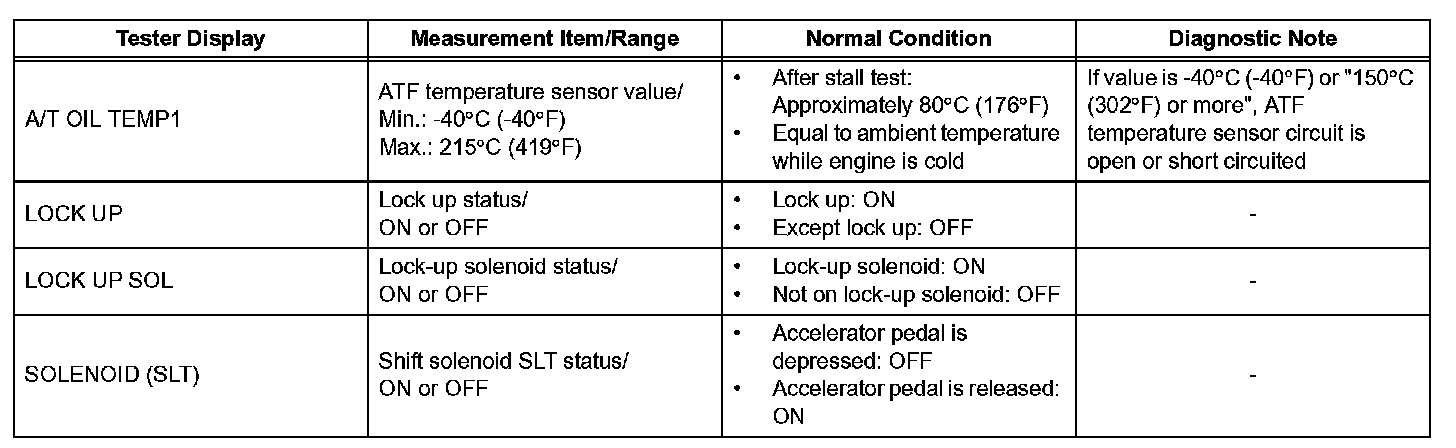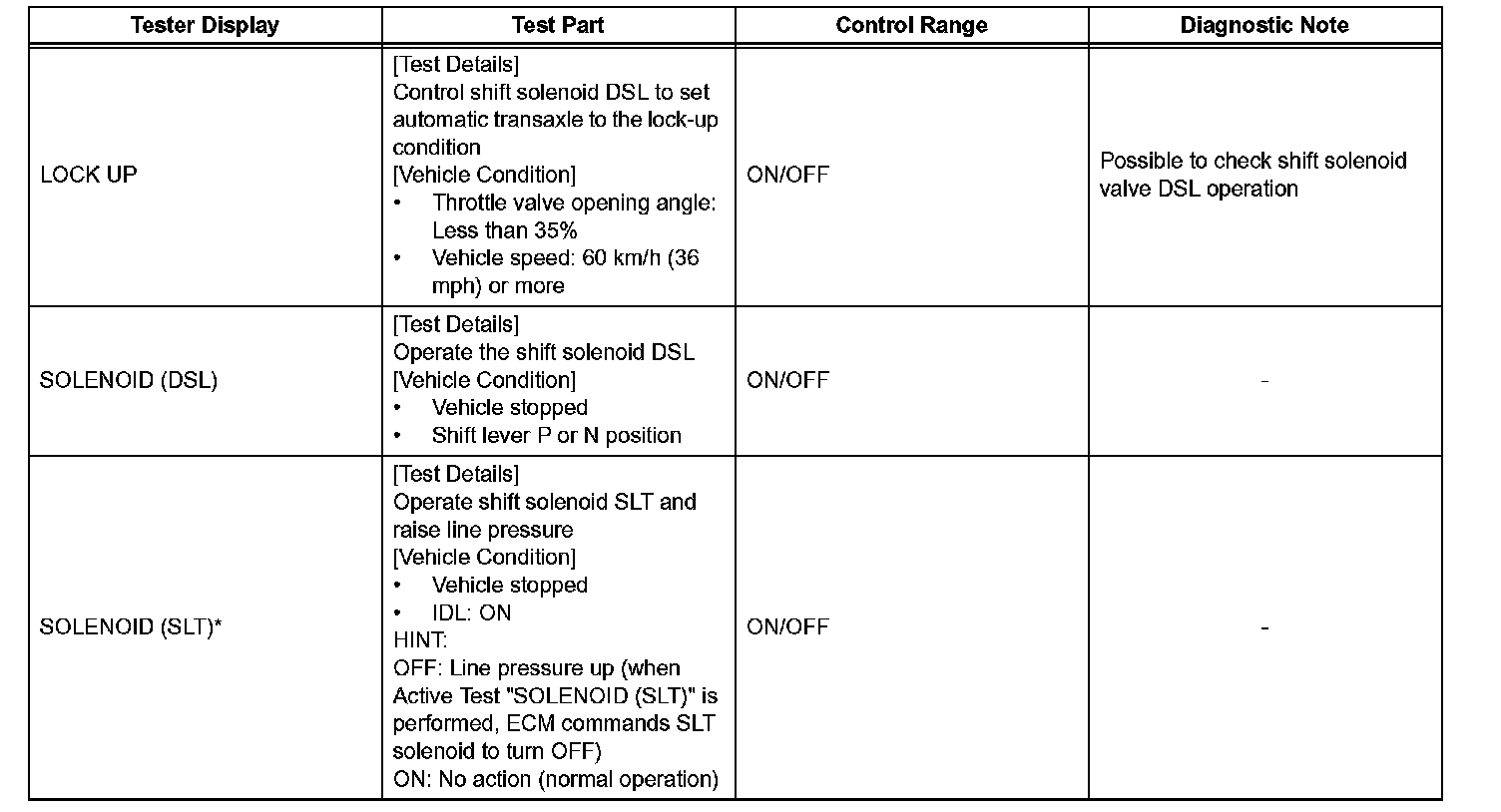 HINT: *: "SOLENOID (SLT)" in the ACTIVE TEST is performed to check the line pressure changes by connecting SST to the automatic transaxle, which is used in the HYDRAULIC TEST as well. Hydraulic Test