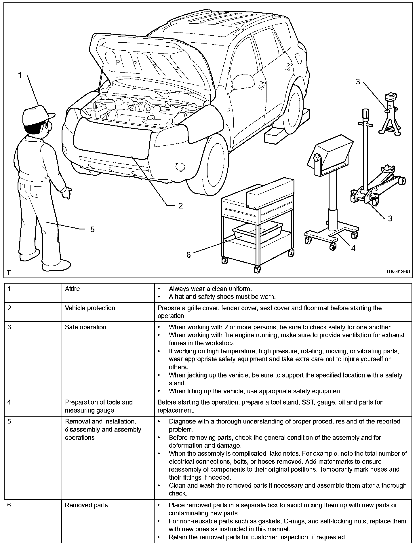 1. Care must be taken when jacking up and supporting the vehicle. Be sure to lift and support the vehicle at the proper locations.