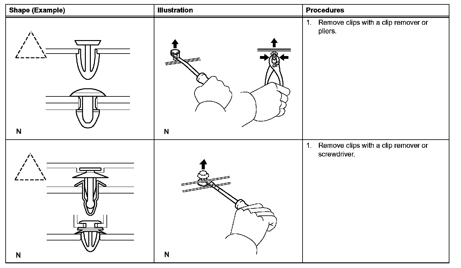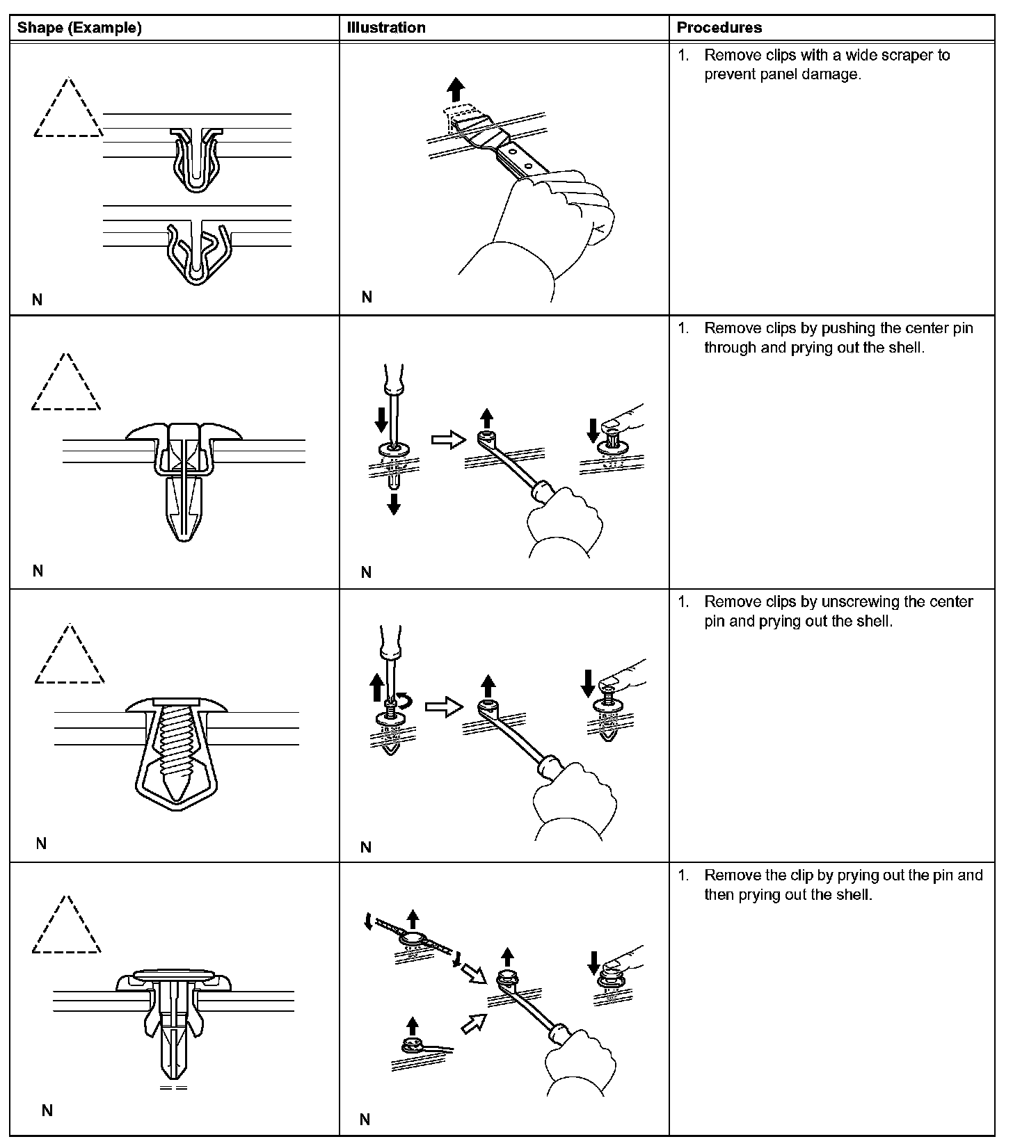 1. The removal and installation methods of typical clips used for vehicle body parts are shown in the table.