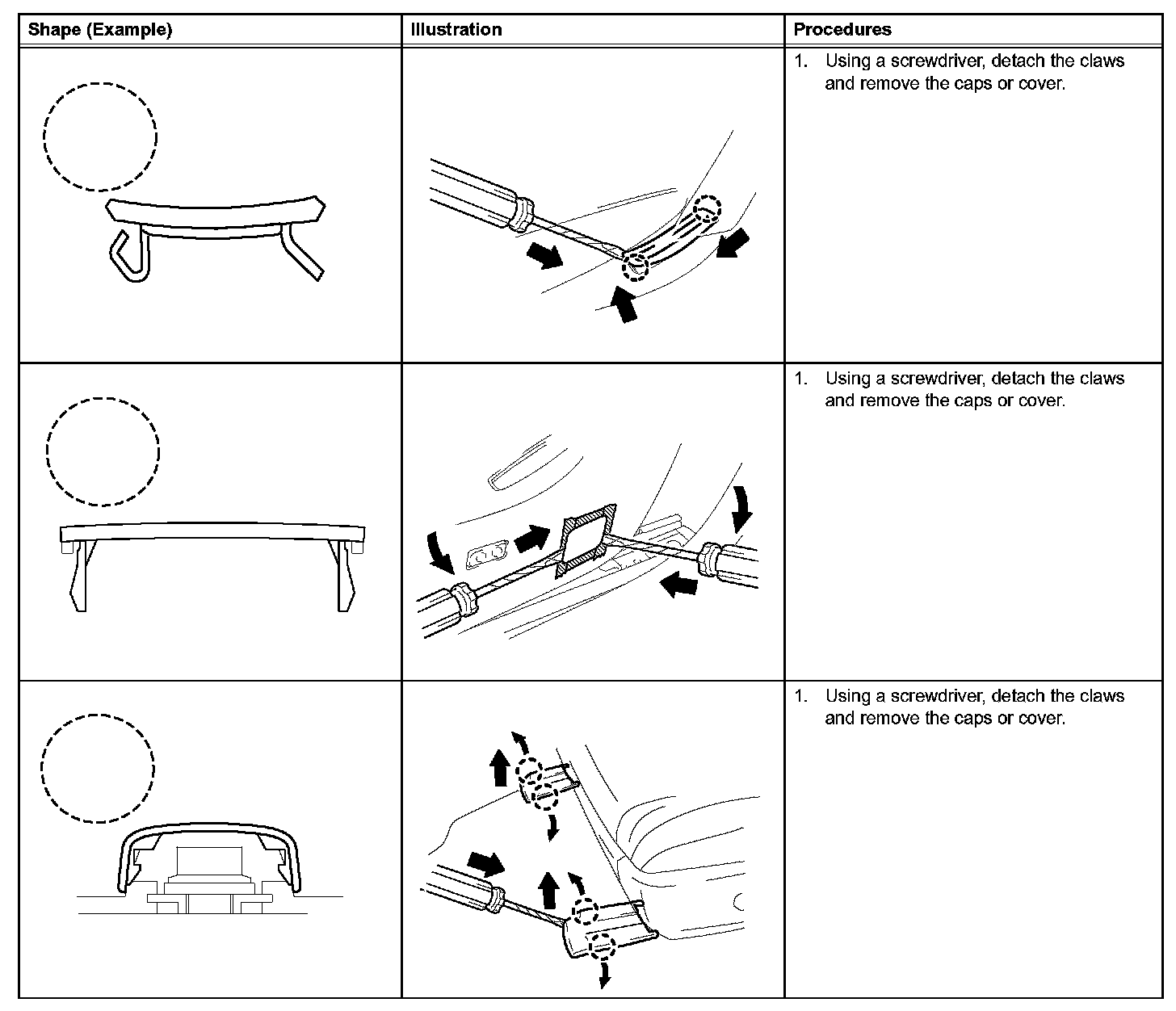1. The removal and installation methods of typical claws used for vehicle body parts are shown in the table.