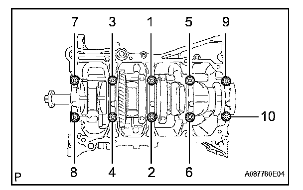 Using several steps, uniformly install and tighten the 10 bearing cap bolts in the sequence shown in the illustration.