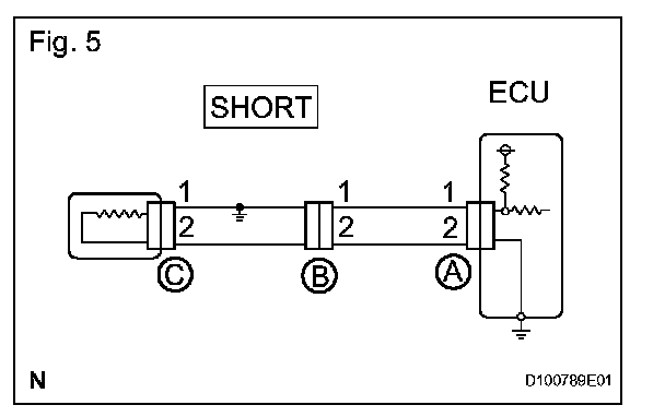 CHECK FOR SHORT CIRCUITa. If the wire harness is ground shorted (Fig. 5), locate the section by conducting a resistance check with the body ground.