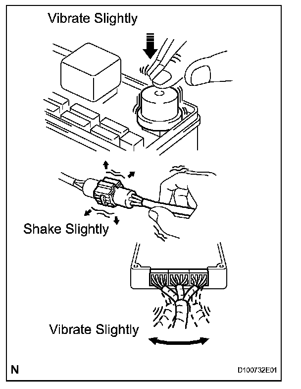 With a problem that only occurs when the engine is cold or as a result of vibration caused by the road during driving, the problem can never be determined if the symptoms are being checked on a stationary vehicle or on a vehicle with a warmed up engine. Vibration, heat or water penetration (moisture) is difficult to reproduce. The symptom simulation tests below are effective substitutes for the conditions and can be applied on a stationary vehicle.