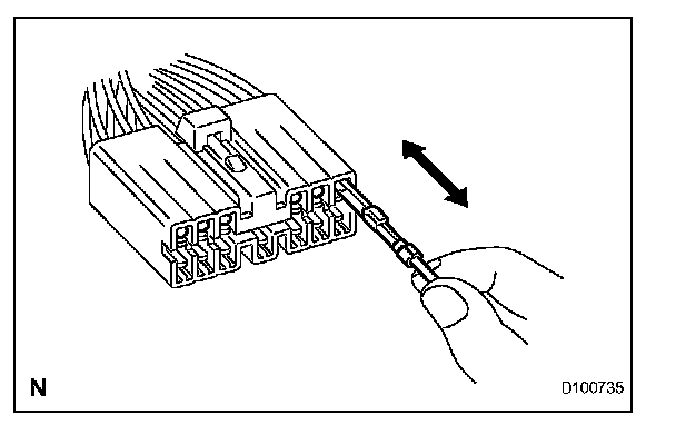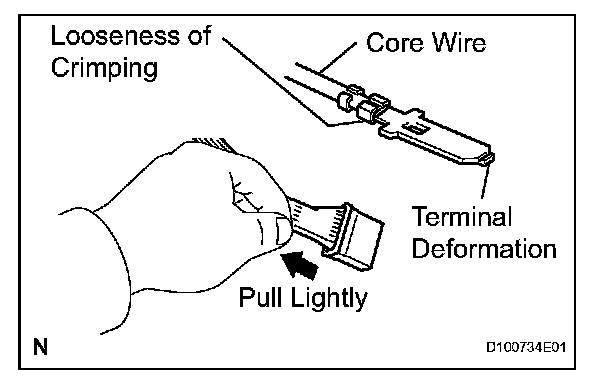 Pull the wire harness lightly from the backside of the connector. Visually check for the following: 1) unlatched terminals, missing terminals, loose crimps and broken conductor wires; 2) corrosion, metallic matter, foreign matter and water; and 3) bent, rusted, overheated, contaminated and deformed terminals.