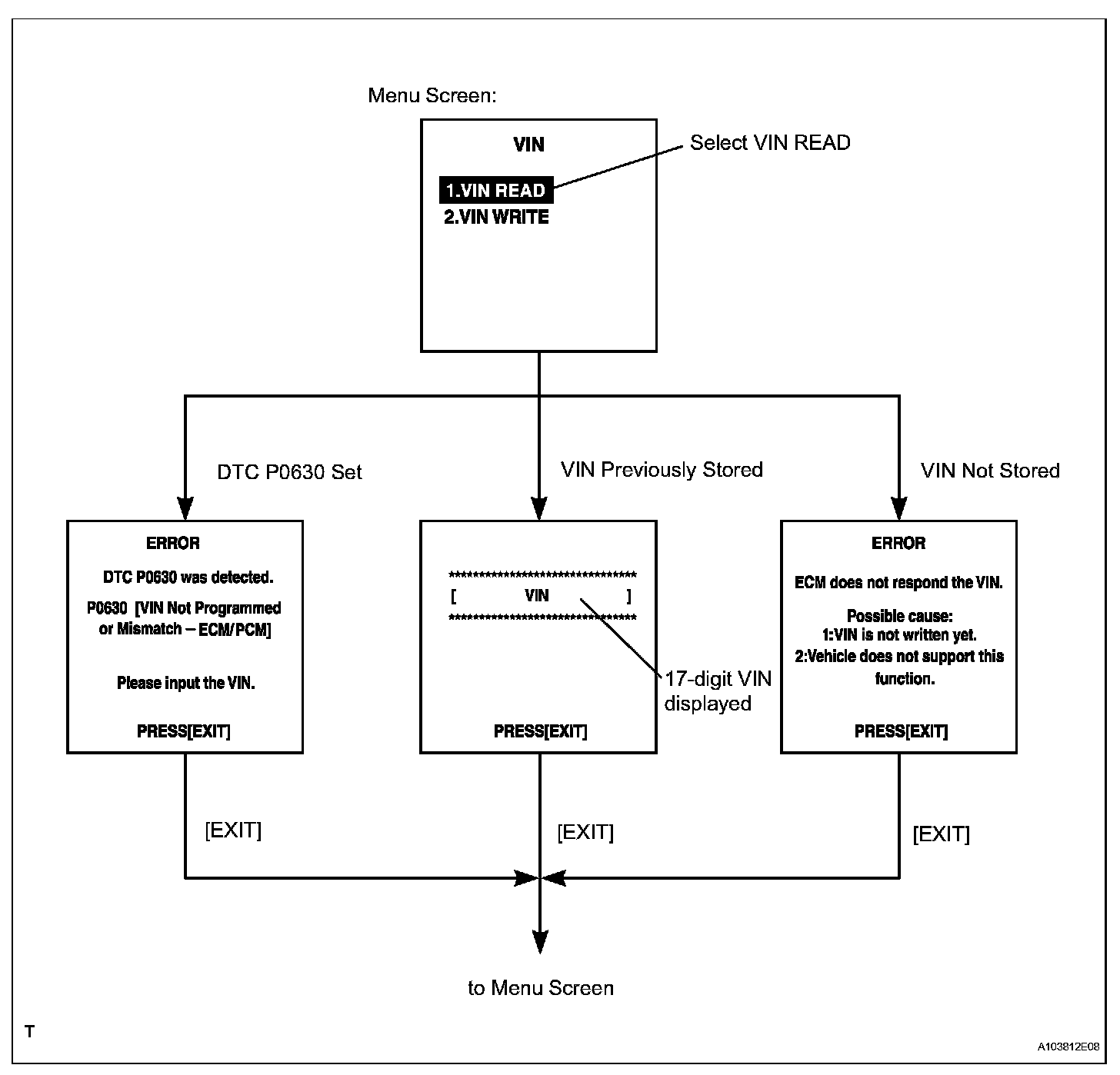 b. Read VIN: Explains the VIN reading process in a flowchart. This process allows the VIN stored in the ECM to be read in order to confirm that the two VINs, provided with the vehicle and stored in the vehicle's ECM, are the same.