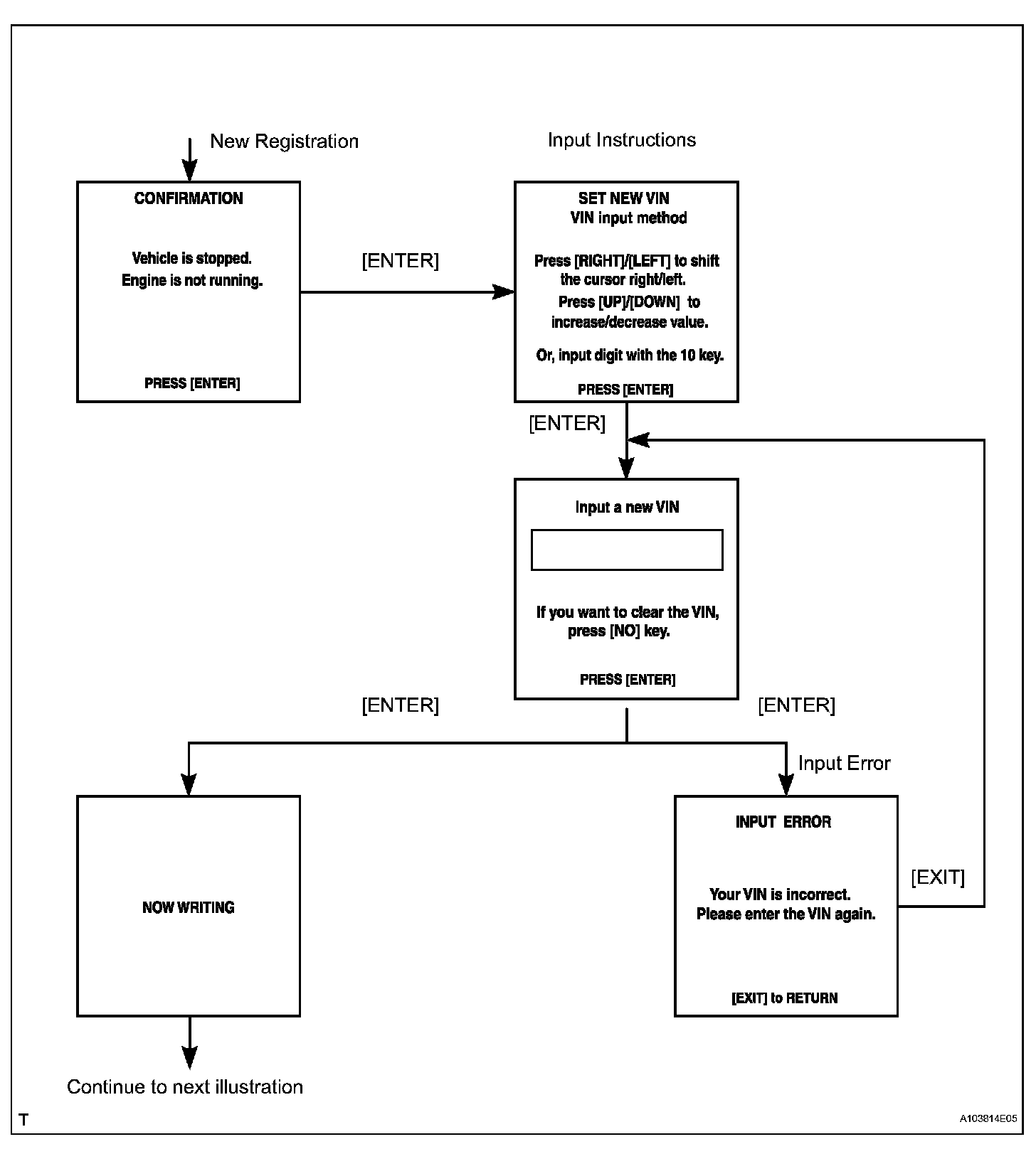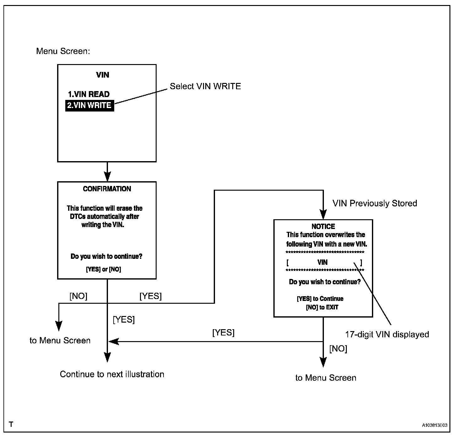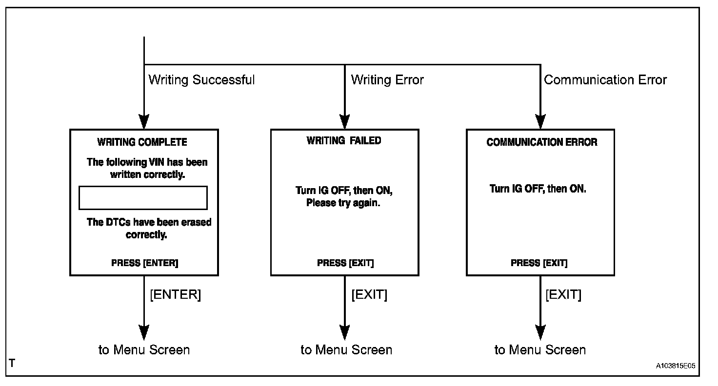 c. Write VIN: Explains the VIN writing process in a flowchart. This process allows the VIN to be input into the ECM. If the ECM is changed, or the vehicle VIN and ECM VIN do not match, the VIN can be registered or overwritten in the ECM by following this procedure.