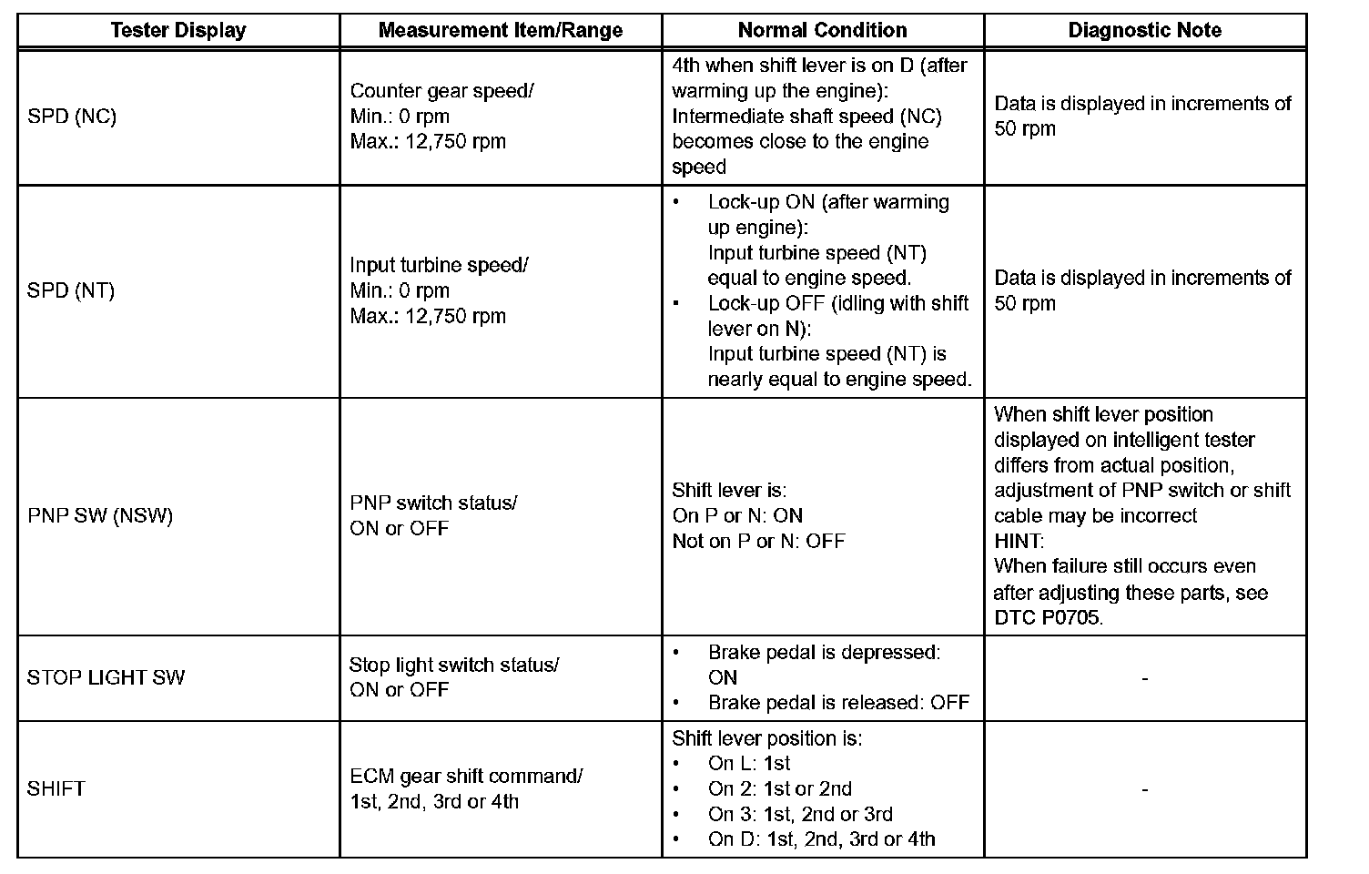 HINT: Using the intelligent tester's DATA LIST allows switch, sensor, actuator, and other item values to be read without removing any parts. Reading the DATA LIST early in troubleshooting is one way to save time.